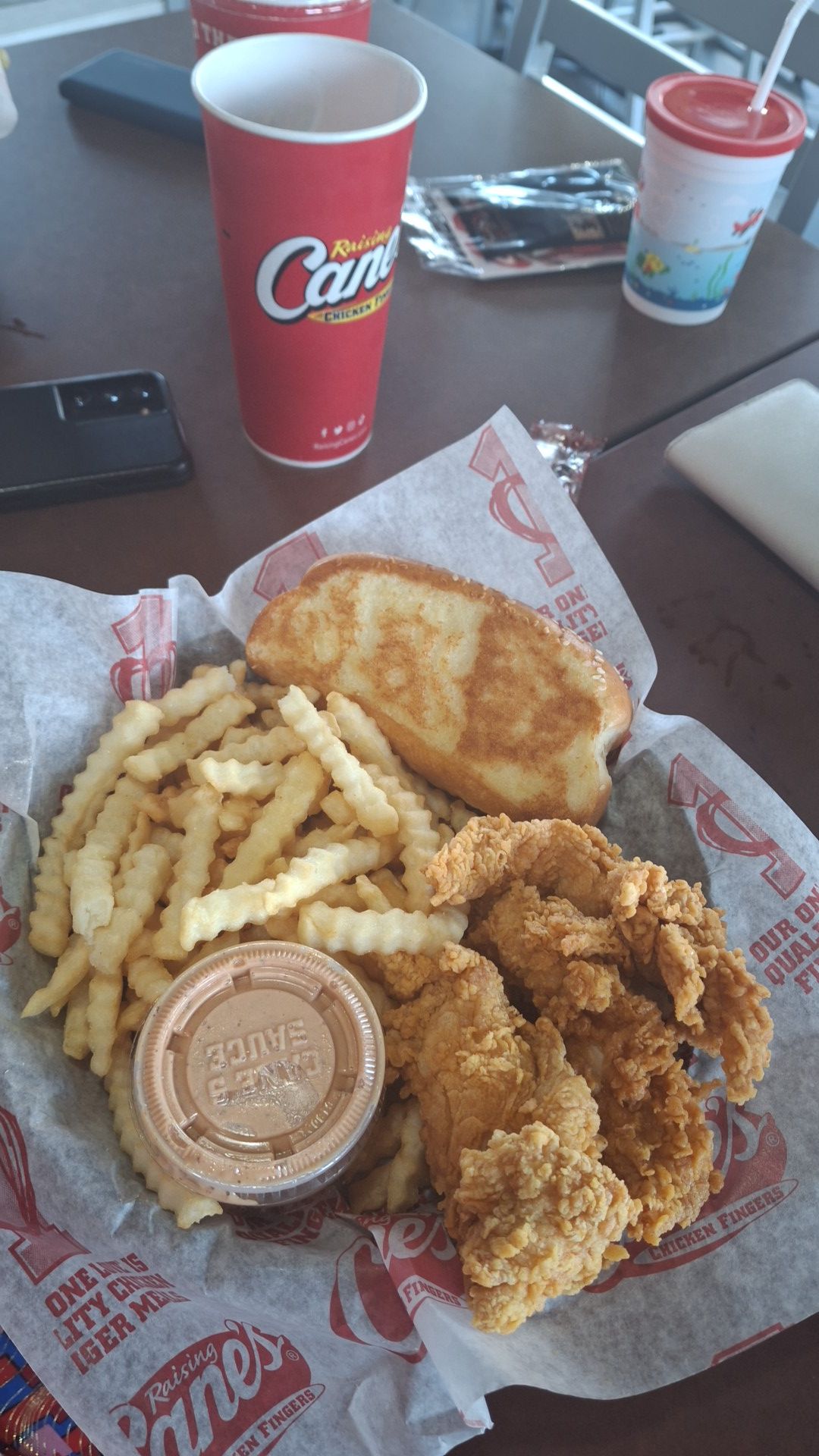 Ā Ā Ā Read moreTonight was the first time that we've tried any Raising Canes. I enjoyed being able to eat in the dining room. The bread was the best thing that we ordered, it was fresh and delicious. The chicken tasted good, I like the breading however, it was the smallest chicken strips I've ever had. Not worth the price I paid for the meal. I didnt like the coleslaw, it was too tangy. The fries although their fresh and they are crinkle fries there not very big but they taste ok and there fresh. I ordered a combo meal and was still hungry when we left. Before we left I ordered extra bread for all of us though because it was delicious and to help fill us up. For the price I paid , we shouldn't have left hungry like we did. 2 strips would have been equal to the size of one strip at other restaurants such as...