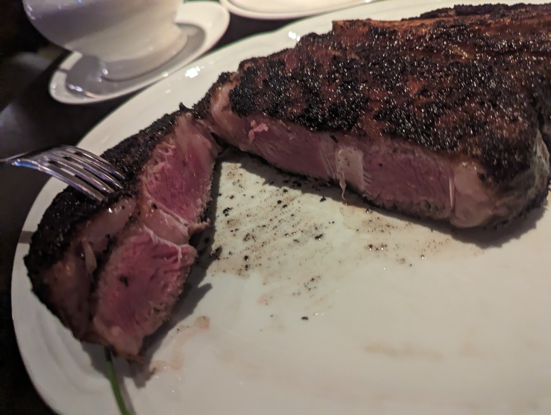 We ordered: A bone marrow appetizer, but they informed us they were out. We got a crab cake appetizer instead An iceberg wedge salad to split A 22oz dry-aged ribeye cooked medium rare for me An 8oz petite filet cooked medium well for my wife A side of baked mac and cheese and whipped yukon gold potatoes to split