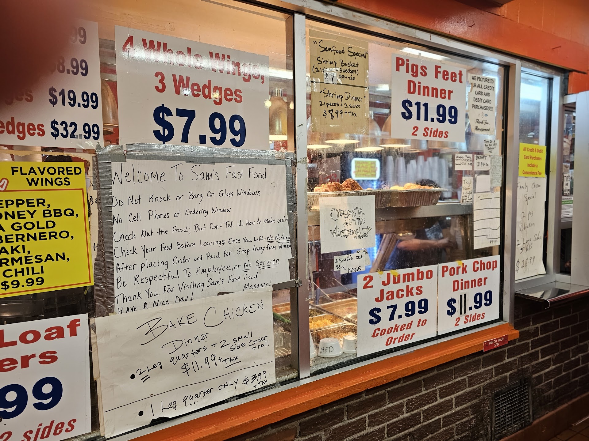 It was our first time stopping at Sam's. We were driving back to Chicago and let Me tellllll youuuuu we were definitely starving. The place is adorable IMO, reminded me a small mom and pop place where everyone in the neighborhood definitely stops by at least once a week. It's no big fancy restaurant it is a neighborhood hidden GEM. The lady taking orders was the absolute sweetest and kindest restaurant employee I've ever had the pleasure to meet. Love that it's set up cafeteria style you can literally see what you're ordering. The macaroni and cheese was phenomenal especially the collard greens, the fried apples, the pecan pie, the peach cobbler was absolutely delicious!!! The wings were fire too, we just needed more hot sauce, the Jack Salmon was an ENORMOUS serving definitely could feed a whole family!!!! The 21 piece shrimp dinner was fire too !!!! Definitely highly recommended!!!!! Amazing hospitality, delicious food!!!, kind employees!!!! Give them all of your money!!!! We are definitely stopping by on our next road trip to try the rest of...
