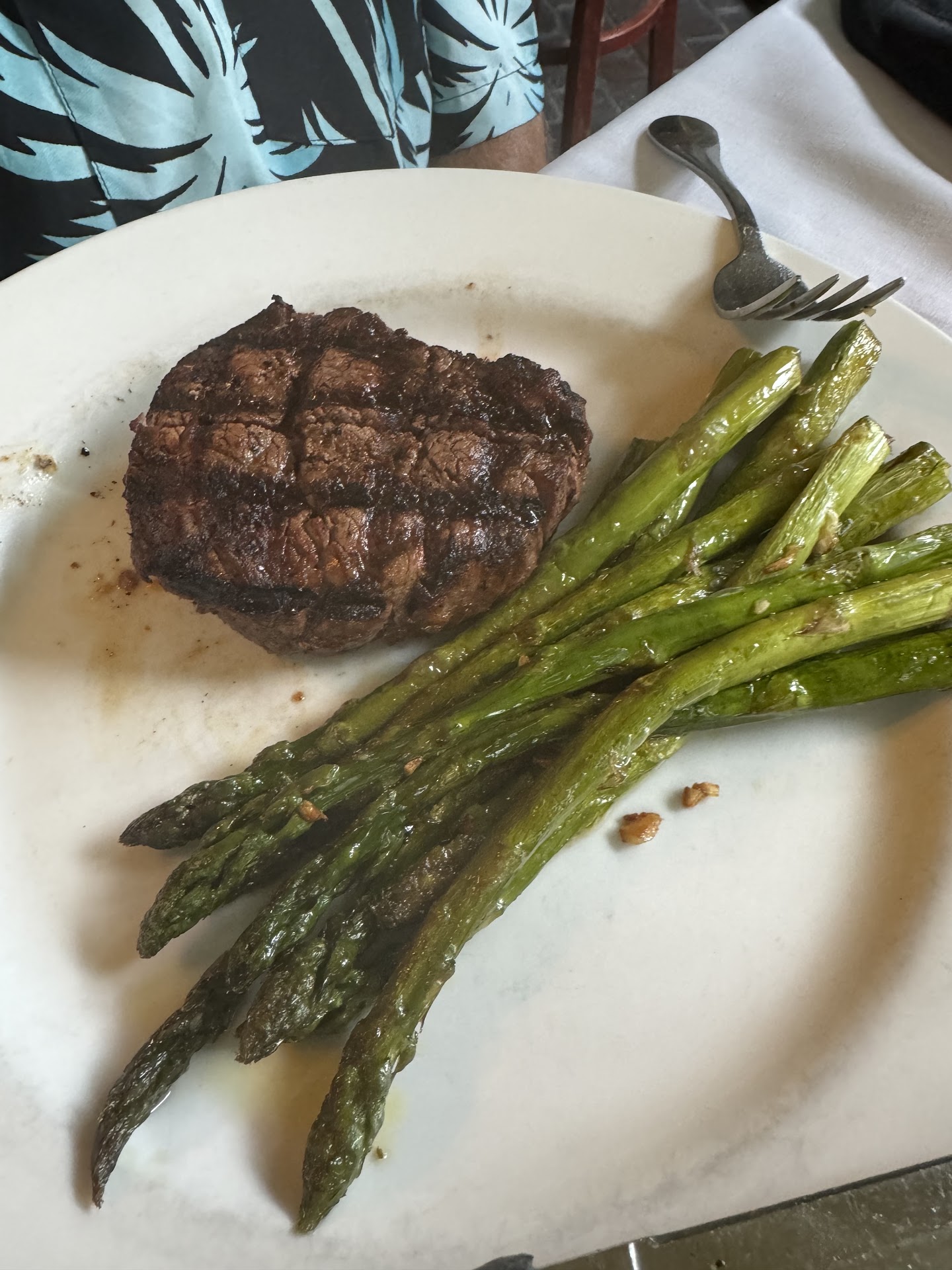 The one person that wanted to make reservations for a Thursday night, was the only one who had everything wrong with his meal. Pleasant, soft spoken server, about 3 tables inside and maybe 4 tables outside were occupied, plenty of servers, so we figured there were enough staff. However, it was lengthy times that we would see her. Everyone’s salad was delicious, except my husband got something he didn’t order, knowing they would have to throw it away, he kept it. It was just as delicious as the garden salad would have been. But then, he ordered the filet, as a splurge, that did NOT come with the “glaze”/“gravy”, and one half was mostly tolerable, but the other was completely rare compared to medium well that he ordered. By the time the gravy came out, separately, he had had enough of his uncooked steak. It looked more like a tuna steak. The asparagus was great at the top, but extremely hard on the stalk. Of course, the stalks are tougher, but it was not pleasant. I will be able to cook the steak into something spectacular for breakfast in the morning, but we were extremely saddened that a place so reputable, that we had only frequented on “special occasion”, was such a disappointment for the one person that was so adamant for a reservation. We will return someday, but not for the steak.