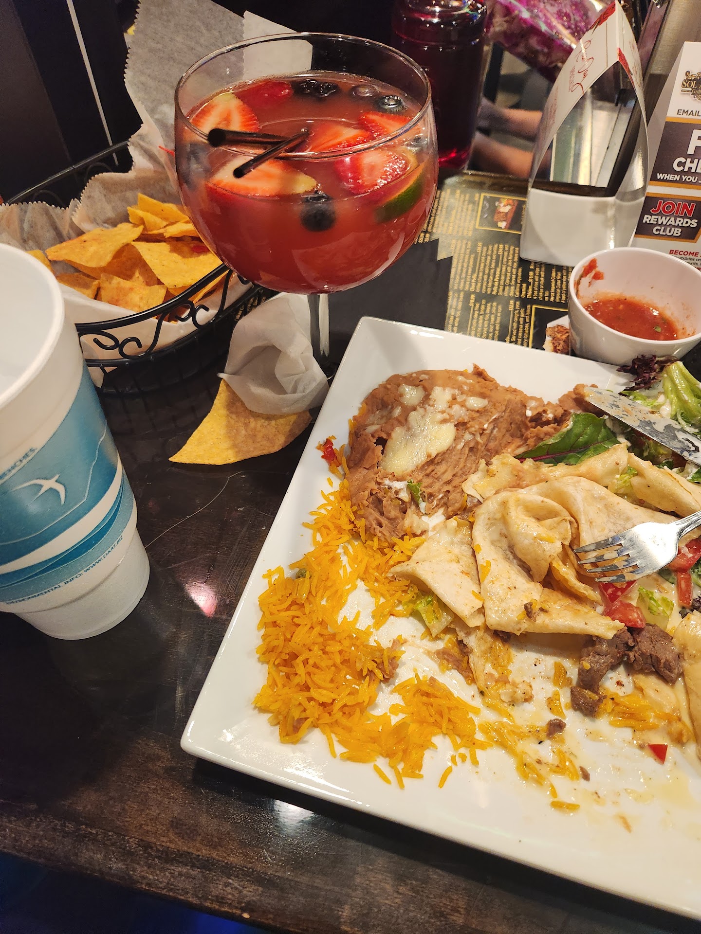 Read moreBefore I get started, my friend and I went on a busy night, so that can be taken into account. We sat at the bar as we were refused seating at a booth due to just us being 2 people. The margarita I got was 14.99. I originally ordered a Margarita flight, and our server told us that they weren't doing flights, only for me to see 5 minutes later, two flights go to a table... my frozen margarita was very watery and not even mixed correctly. I sat right where they made the drinks and saw other servers use the blender. My server poured a lot of puree mix at the bottom of the cup and put the frozen pre-made mix on top. (Which would have been fine if half of it wasn't puree) They do not use gloves for anything, and the fruits that go in the drinks are put in with bare hands. When I finally saw our server again and told him I didn't like the drink he replied that is what I ordered and gave me a to go cup with ice and suggested that I would like it better with the ice. It took 20 minutes for the chips and salsa even though they were being served at tables around us. We only got to order due to the nice couple sitting next to us, and they paid for my flight. That is what saved our night. Overall, the atmosphere was nice and lively, and the food tasted okay. I ordered a Carne asada burrito. Also, yes, I still tipped whatever was recommended. (I wished I had gotten a better pic...