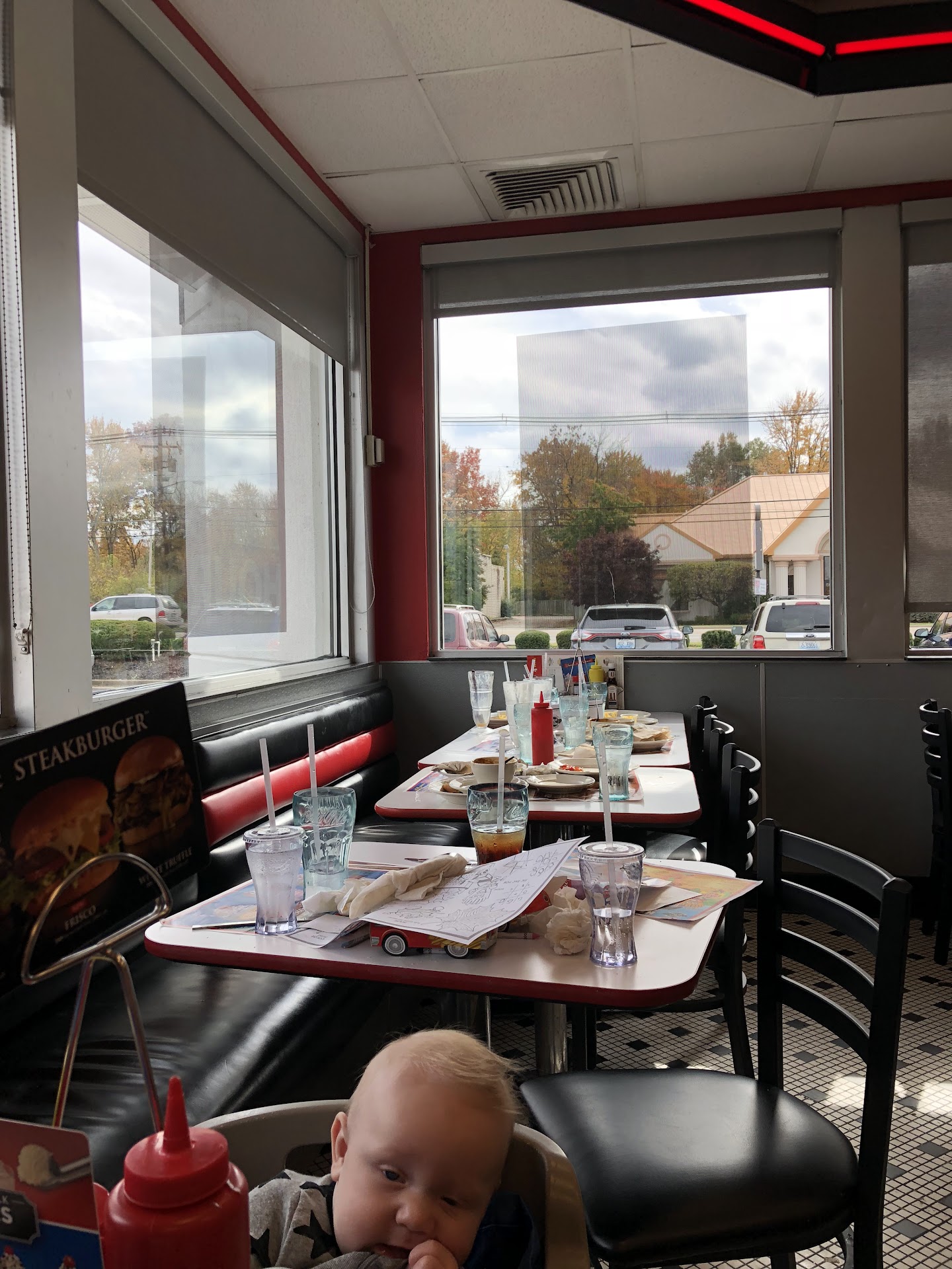 When she came to take our order (after we waited there at our table for at least 5 minutes), she sat down and started complaining about her ailments. She took our orders, and several had ordered shakes. When she came to bring us our drinks (literally 10 minutes later), someone's drink never made it to our table. A few of the people who had ordered shakes had seen a strawberry cheescake shake advertised on our table, and asked if it was too late to put in for that instead of their original shake orders. She responded, "The strawberries are frozen, so we can't make it." However, my son had a small strawberry shake and managed to get his.
