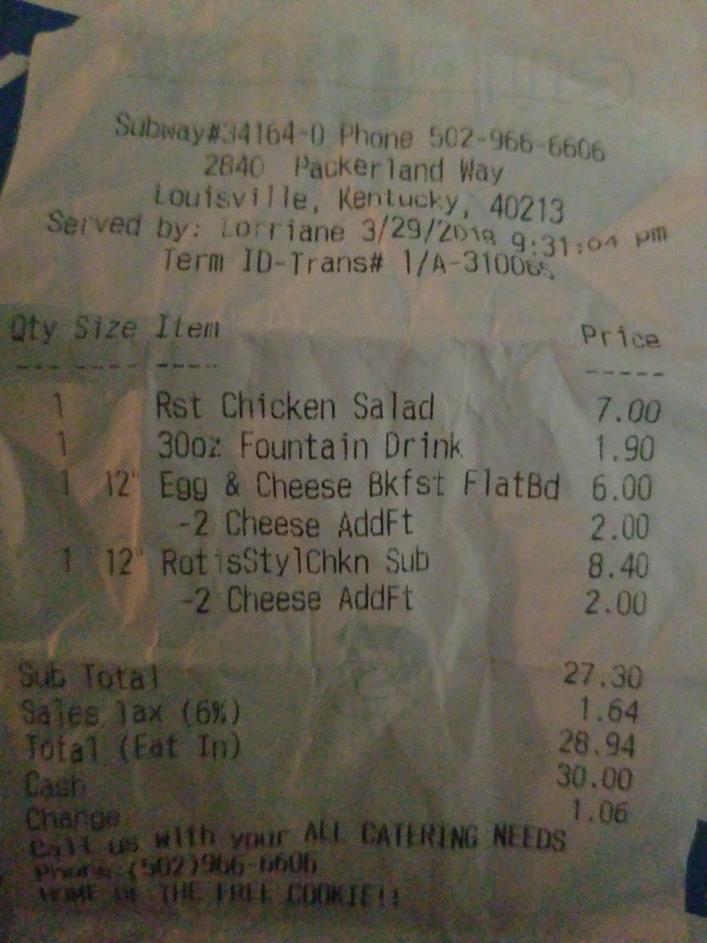 šµšš¤® NOW! went to Location got 2 of the Worst Sub Sandwiches in my Life. Smashed the size of eggs wrapped in Subway wrap to appear as though they were Sandwiches or Subs if you can imagine a Sub you order that suppose to have Bacon & chicken was suppose to be on one with just lettuce and tomato Nothing Else! It had Lettuce š„¬ two Tomatoes Boy did have Lettuce half apiece of Bacon while the chicken was smashed in the bread what little chicken was on it. Sandwich 2. Was suppose to be Roast Beef ( Wereās the Beef ) another half apiece of bacon suppose to have Salami one thin piece, No Avocado But that was on it along with Lettuce š„¬ that made up were the meat wasnāt there when I stated Lite on the Lettuce plus it had mayonnaise on it. Plus what smelled like vinegar! This on White bread Squished liked the other one as if it were the size of a bottle of Vitamins(small bottle) wrapped in Subway paper with a red or orange sticker on it both of them. Was Charged $1.50 twice for each Half piece of bacon So one whole piece of bacon cost $3. I could have gone to FireHouse Subs and got a Real Sub for $8