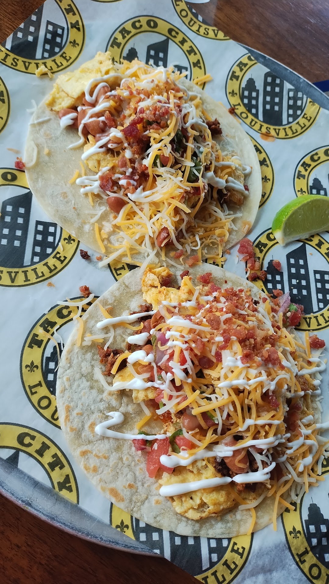 Yo vivo en Texas. Real Mexican breakfast tacos come with frijoles spread on the tortilla. But here, theres whole pinto beans mixed into cold scrambled eggs mixture, with creme, queso frio, bacon.....just.....idk what this is.