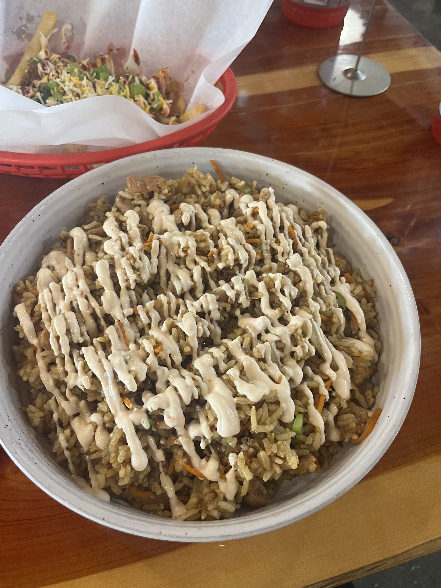 Read moreWe stopped here while we were driving through Kentucky to back home in Alabama. It wasn’t clear at first on how to order, but once we figured it out, we decided to order from Fresh Out of the Box and Str8 Drop Wings. We ordered the chicken fried rice, a half order of kimchi loaded fries, and The Flying Pig chicken sandwich. While we waited for our food, I decided to get a dessert from the cheesecake place. We went with the Biscoff cheesecake. We only had to wait for about 5-10 minutes for our food to be ready and brought to our table. It was all steaming hot and very fresh. The chicken fried rice was such a huge portion. If the instructions on how to order had been more clear or if someone had greeted us at the door, the experience would have definitely been a 5/5. The food was amazing and we enjoyed the atmosphere. Whenever we drive through Kentucky again, we will be back...