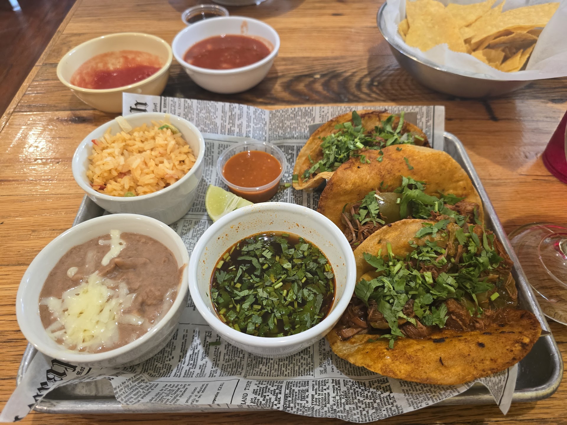 We arrived about 45 mins after they opened for lunch on a Sunday. The entire restaurant was freezing. After being sat down at the table we sat a few minutes before chips were brought out. Then 5 minutes or more after that a different person brought water and walked away. Then about 7 minutes after that a different guy asked for our entire order at once. My sonâs taco was wrong so I had to remove some ingredients, because no one came back to check on us, and the taco was so over cooked it poked his gums badly and the meat was very dried out. My quesadilla was very greasy and the cheese was congealed. The portions were very small for the cost. Then no one checked on us for a long while. Finally I got my card out and had them go ahead and just run it without bringing the check. He then brought it back with no pen and quickly walked away. We waited for about 5 minutes to get a pen and still didnât come back. The quality of the ingredients were just bad. Both of our stomachs werenât right after. We finally just left and noticed no workers as we walked out. This was our second try since they opened here and we wonât be back. Very sad because it s a great...