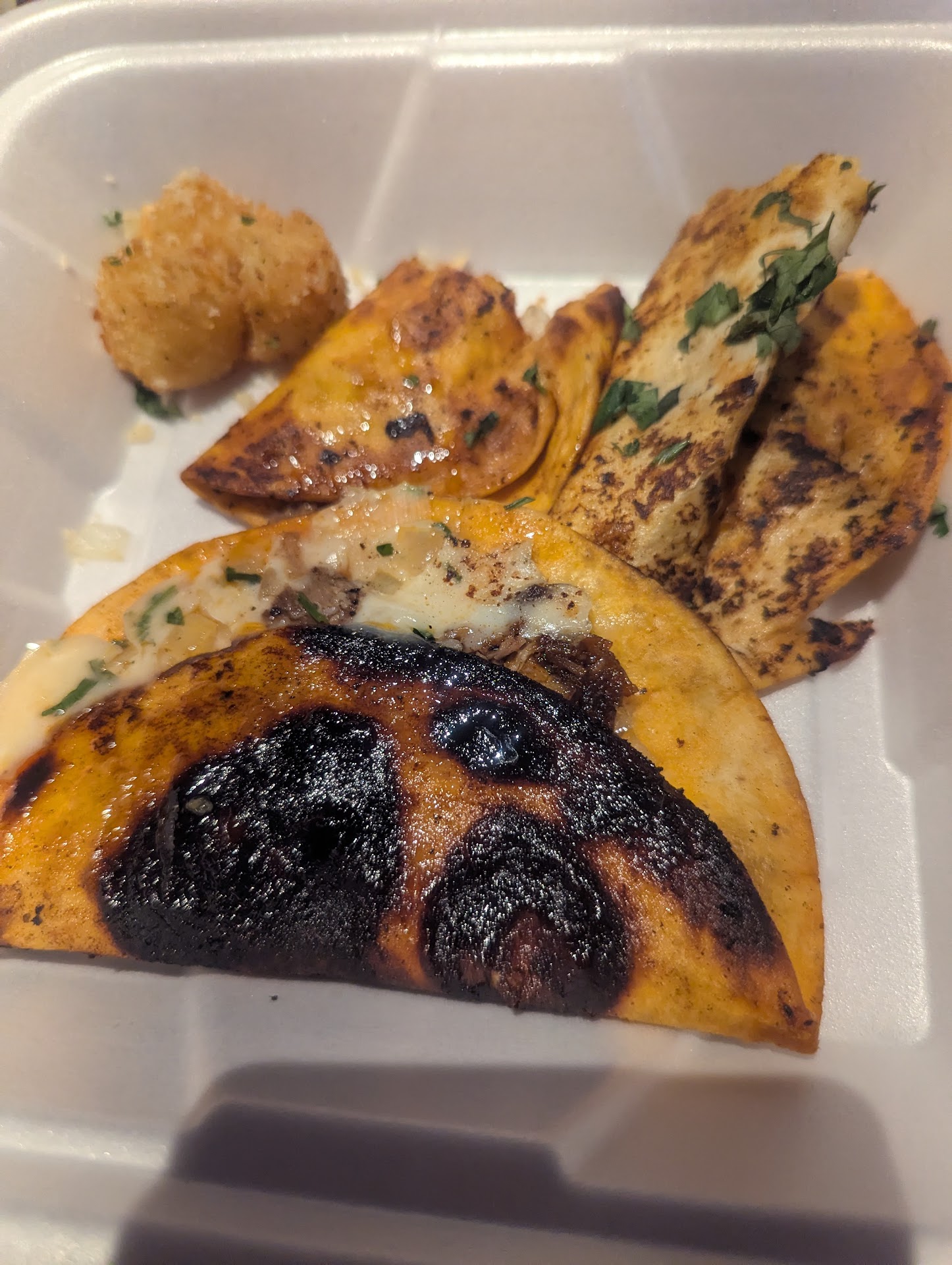 Food: peaks sampler, birria tacos, philly cheese steak with a side of adult Mac and cheese. Our sampler came out with the main entrees and the food was cold. The mozzarella cubes were still frozen, the fried pickles were cold and greasy, the buffalo chicken was luke warm but the sauce was good. The birria tacos were SOGGY and burnt yet still somehow, came out cold. The philly was not mixed well with some bites being over seasoned, others tasted like there was no seasoning. The mac and cheese was by far the most edible thing served.