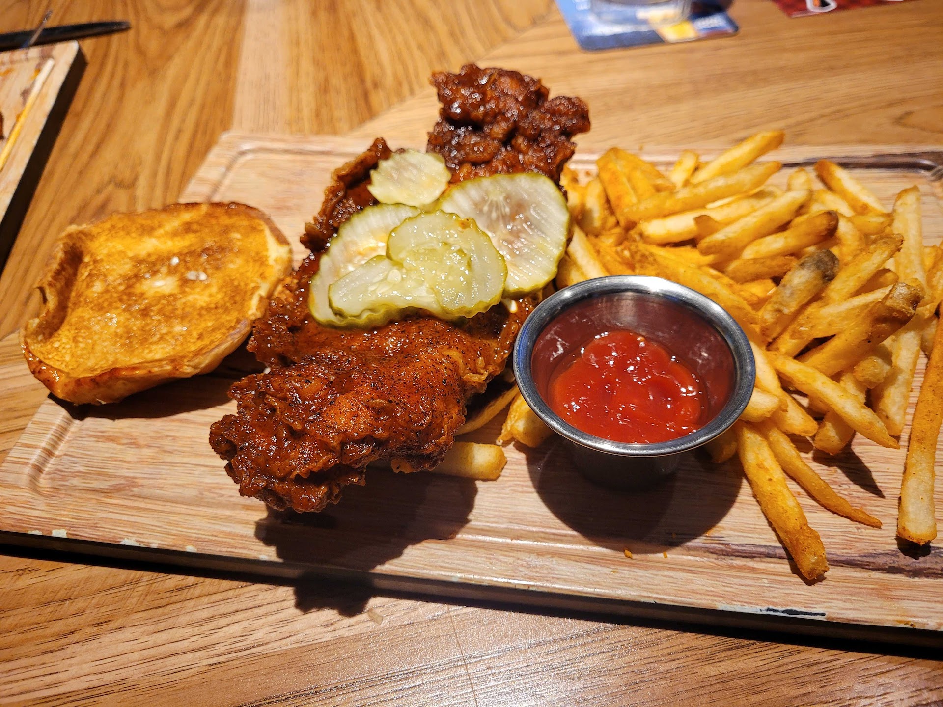 The sandwich arrived like a royal decree—a towering marvel of spice and succulence. Its scent was a siren song, daring me to uncover its secrets. The first bite was a revelation, a tempest of fiery heat and tender sweetness. The crunch of the perfectly fried crust gave way to a juiciness that could rival the freshest of kills. The pickles, sharp and tart, cut through the heat with the precision of a well-aimed spear, while the buttery brioche bun held it all together like the unyielding bonds of destiny.