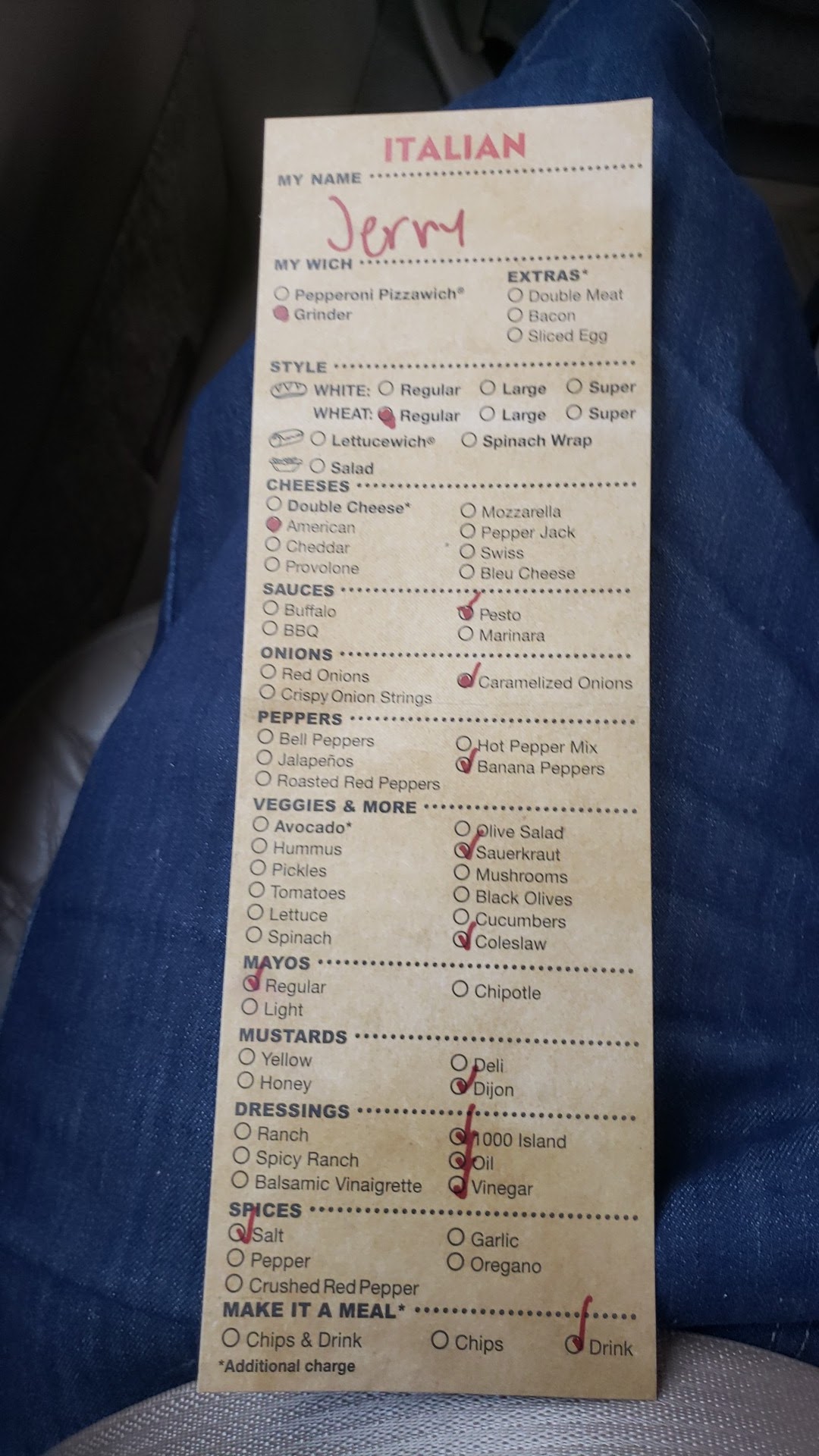 Read moreJust ok...there are a lot of sandwich places around, so it would have to really be "superior sandwiches", but they are just ok. My main problem is the operations aspect. You grab a bag and are supposed to use the pens to mark out ingredients you don't want. At most places, they put a whole extra line on your order with "NO TOM" or something. There were hardly any people in the restaurant but still it took about 10 minutes to get my sandwich - so they didn't rush, but still missed taking off the ingredient I didn't want. They made another sandwich, right, for me. But as a hot sandwich, the turkey was still cold. They had sent the sandwich through a mini toaster, but the bread gets hot, but wasn't enough to warm my Turkey and Stuffing. Weird having cold and hot in each bite. They have special thick cut home made potato chips! Oh boy! Except, they are all made with pepper. Why not make some salt only? So, a just ok sandwich, with pre-bagged frito lay chips (because I don't want your pepper ones), in a fairly sterile environemnt with lots of ads (the "radio" says "Wh1ich wich" between each song, and you get the founder talking about superior sandwiches at one point). Less talk, how about make a better tasting sandwich, correctly the first time, and quickly? I won't be back - Jersey Mike's does custom sandwiches but faster and correctly. They do have more bells and whistles (e.g., stuffing with turkey) at Which Wich, but still just not well designed as a restaurant. They have a lot of employees in that park area by Cabela's so they should do fine, but not worth driving there if you don't...