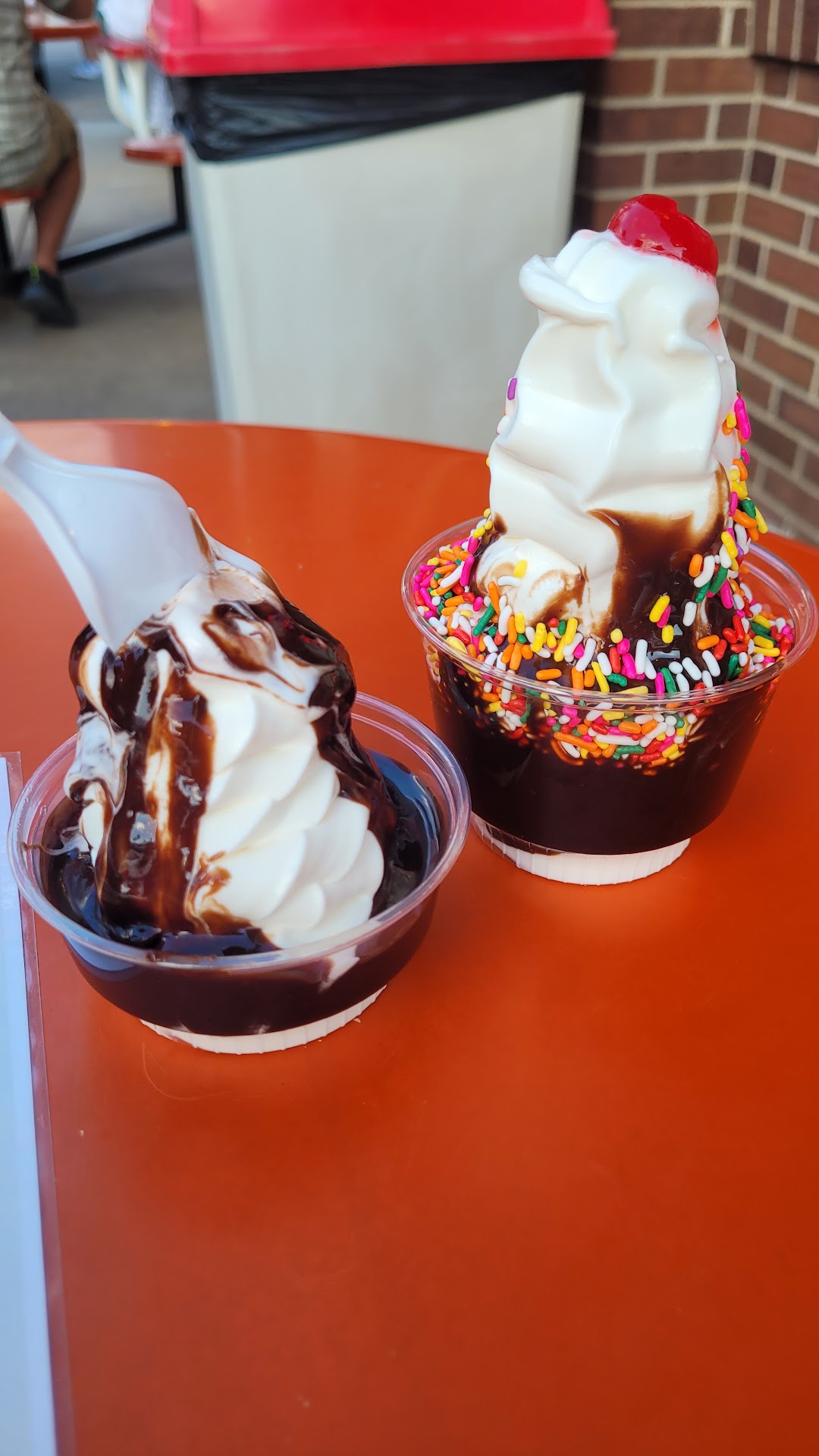 ย ย ย Read moreUpon pulling into the parking lot, the first thing we see is the bathroom located on the outside of the building with handwritten notes on the door to return the key. First impression: "Dairy Dumps". Gave them a chance anyway, we were excited for the nostalgic ice cream and hotdog shop. Unfortunately, we never got our ice cream or our hot dogs. We ordered two coney dogs and after a nice long 25 minute wait (while everyone else who walked in after us were served almost immediately) they dropped a brown paper bag on our table with two soggy hotdogs inside. No baskets? I clearly remember telling them we were dining in. That's why they were waiting to serve our ice cream until after we ate our hotdogs. After the bag was heartlessly dropped onto our table with a "here's your food" nasty attitude, we opened the hotdog bag up only to find old, cold, soggy hot dogs. It doesn't take 25 minutes to make two hot dogs. Since there was no way in Loveland we were going to eat those soggy dogs, we kindly took them to the counter and asked for a refund. They tried to only refund us for the hotdogs and not for the ice cream we also never received and upon asking for the FULL refund, they made a huge fuss and got angry with US! We are the customers, we wanted to have a nice time in the establishment with our family and enjoy what so many other people have described in these reviews. This is not what we got. We got a cold hearted person who angrily reversed our credit card charge and No Apology. Perhaps if they had managed themselves better, we would have given them another chance some other time. Now they can count on us never coming back and sharing our experience on the internet and with our family and friends. Complete disappointment. BTW, it took TWO full weeks for the charge to reverse on our credit card....
