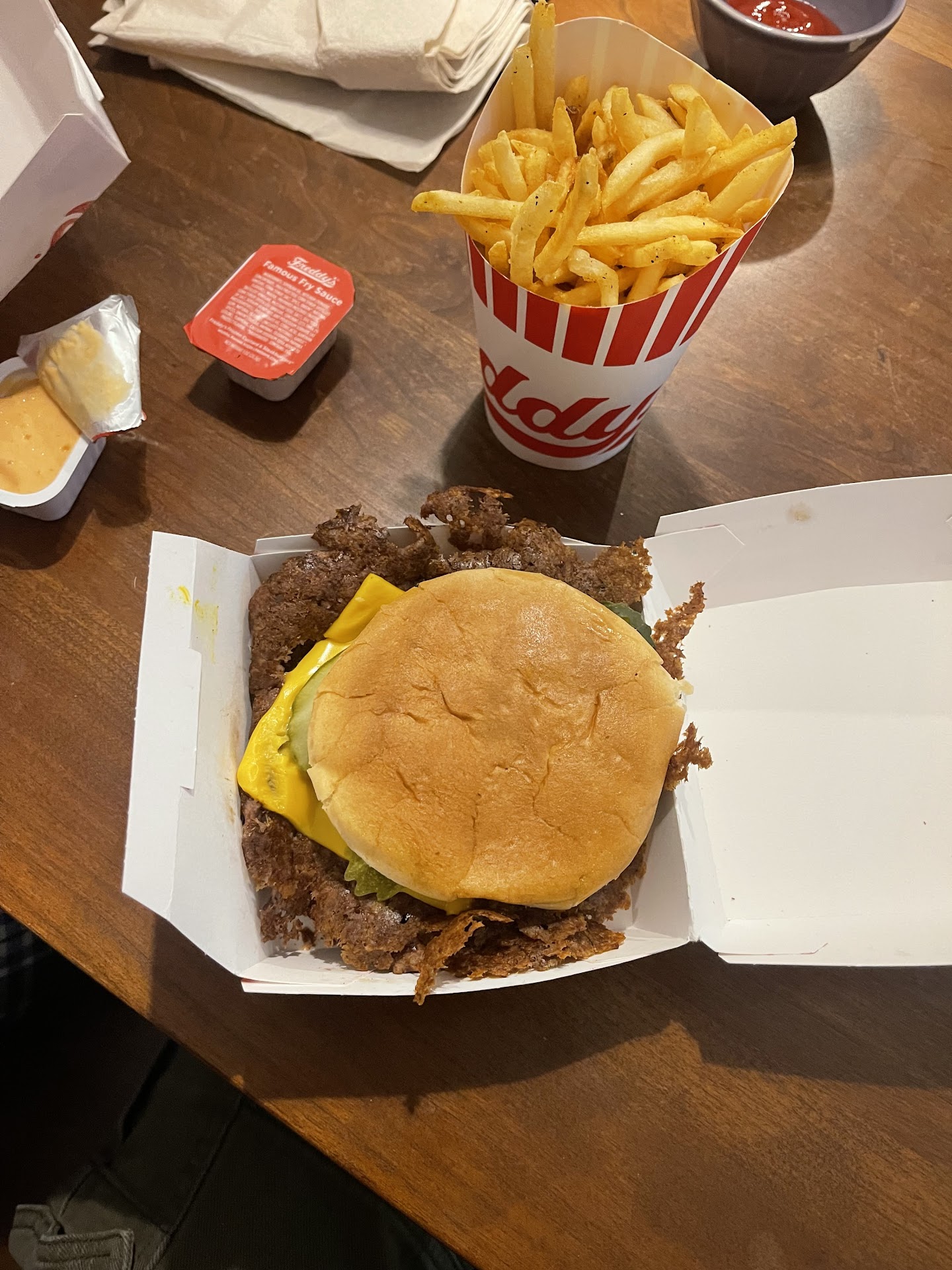 The cheeseburger was cold, the bun was smushed, and the beef patty looked like something scraped off a grill that hadnât been cleaned in weeks. The patty was dry, flakey, brittle, and burnt to a crisp. To make it worse, it looked like someone had taken one sad excuse for a patty, split it into two pitiful halves, and topped them with plastic-looking cheese that didnât even have the decency to melt. Oh, and the underside of the patty? Slimy. Absolutely repulsive and completely inedible.