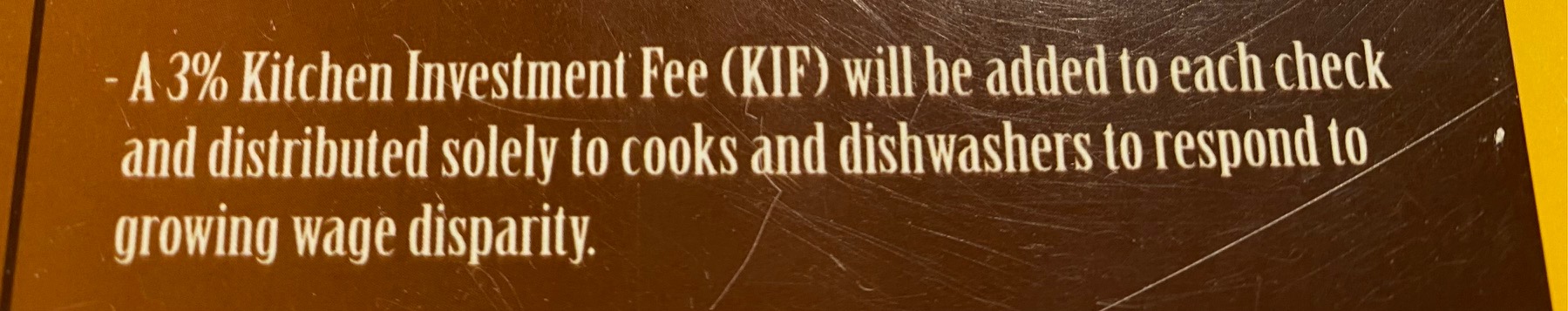 We notice on the menu, they now charge a 3% kitchen and dishwasher fee (image attached). I'm fine with restaurants suggesting we offer to tip to the back of the house, however I feel they should be tipped just as a server is tipped on service. NOT automatically add 3%. If the food is terrible, then the tip will reflect the food and if the service is terrible, the tip reflects the level of service received.