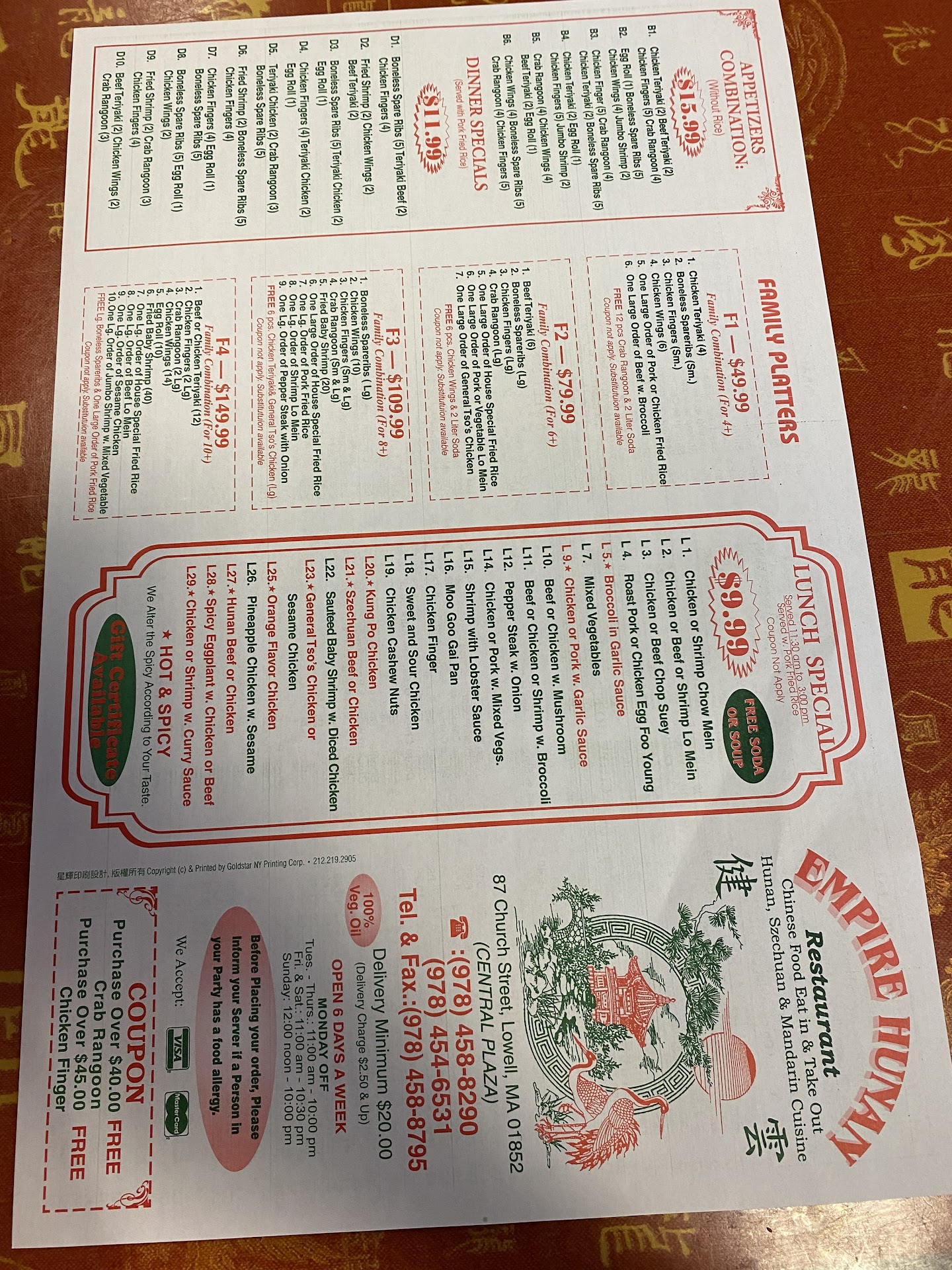 Read moreI had delivery. I have been searching and trying out places, since the Jade East in Tewksbury went bad. This place is the closest food I have found to the old Jade. Ordered only 3 appetizers and best I have tasted in some time. Delivery in 30 minutes, and delivery young man was very polite and professional. There is just one thing that bothered me though. The regular size containers were clearly small containers and the large container was the size of an average container. So that might put a hamper on leftovers. And disappointed that there wasn't at least one fortune cookie in my order and they do skimp on the duck sauce. Still giving them a 5 for how good the food tasted. I am okay with overlooking those little spoileges to get well textured, good tasting food any day. I will absolutely be ordering...