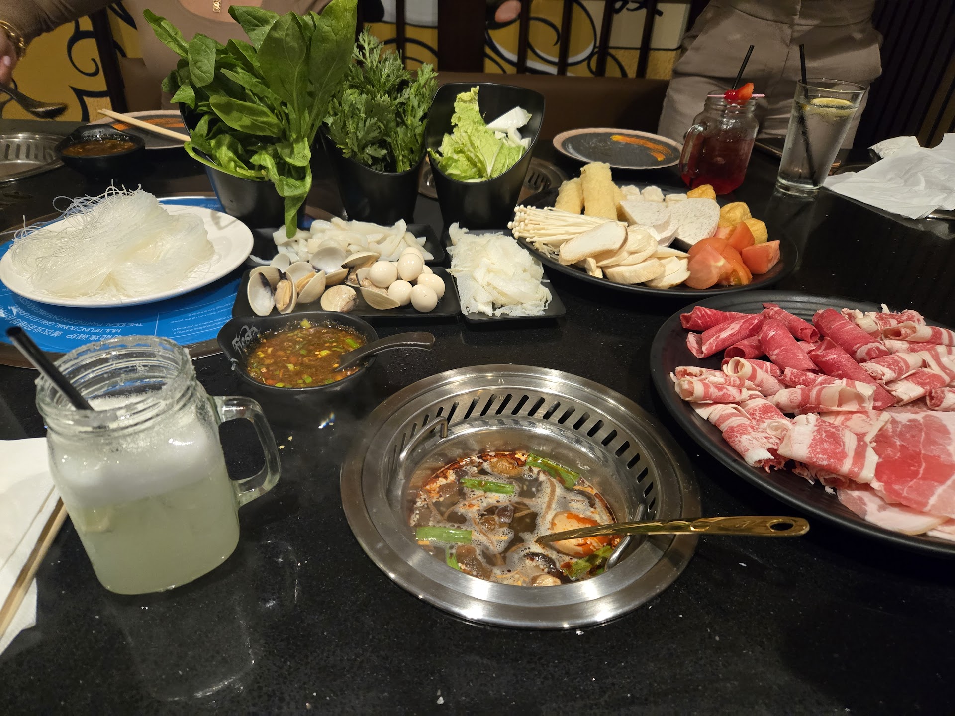 We visited around 6 PM and were seated immediately. The hot pot broths—pork and Szechuan Spicy—were flavorful and customizable with seasonings from the sauce bar. Both hot pot and BBQ had excellent protein and side options, all fresh and well-prepared.