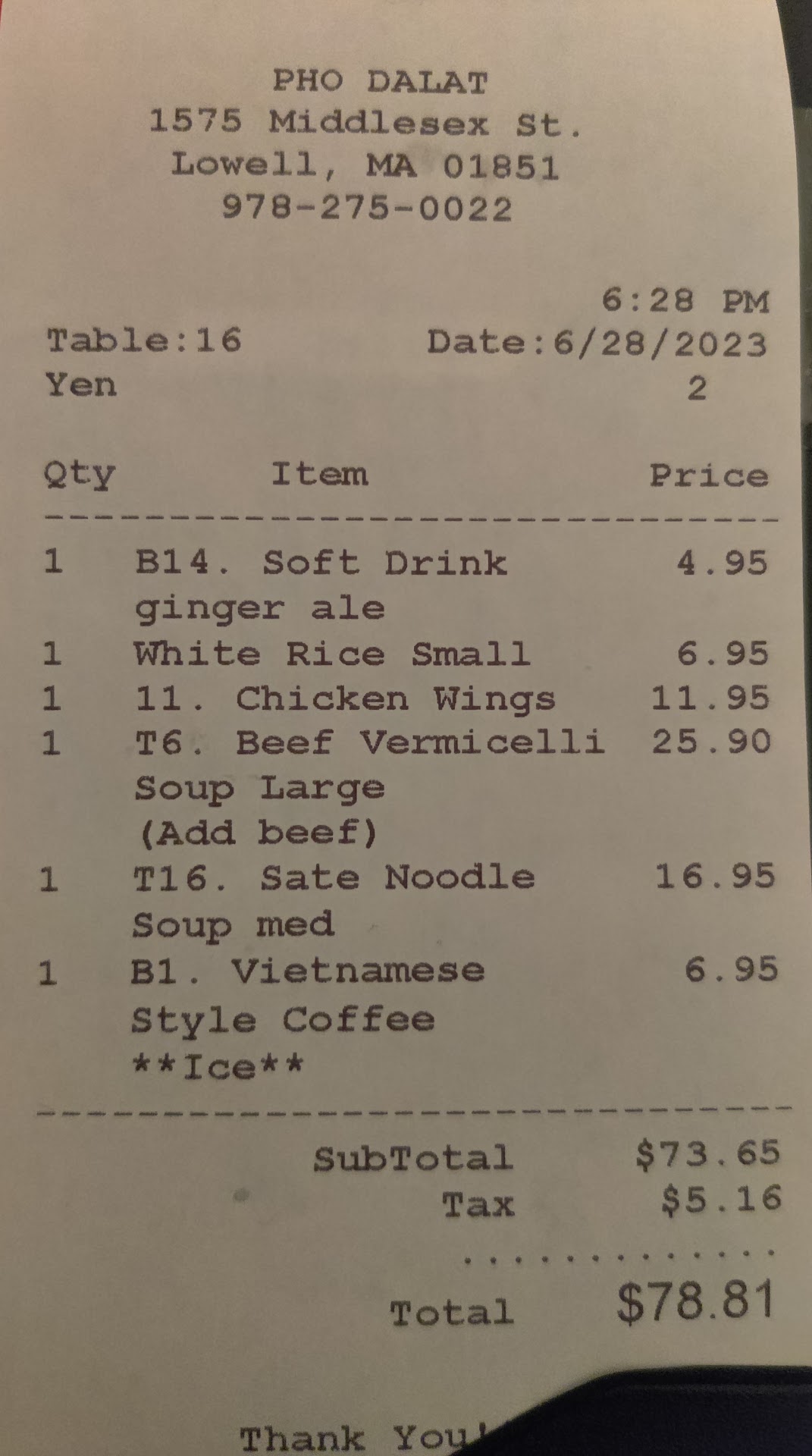 Read moreThe original Pho Da Lat in Lowell was superb with careful attention paid to cuisine, atmosphere, and service. The very BEST Vietnamese food in New England (our opinion). That was 15 years ago. Today, they have expanded to 3 locations (good business), but the Chelmsford Street location was a disappointment. I ALWAYS order my favorite dish, Bun bo Hue. This one was diluted, weak with little flavor and 5 tiny pieces of beef. The coffee was also diluted, and the atmosphere was dreary. There were NO other customers on a late Saturday afternoon. The original location presented Bun bo Hue with outstanding flavor, tendon and hearty beef, strong coffee, and a beautiful atmosphere that welcomed their guests. And the place was always packed. What happened? The original Pho Da Lat is a treasure, this other one will give the...