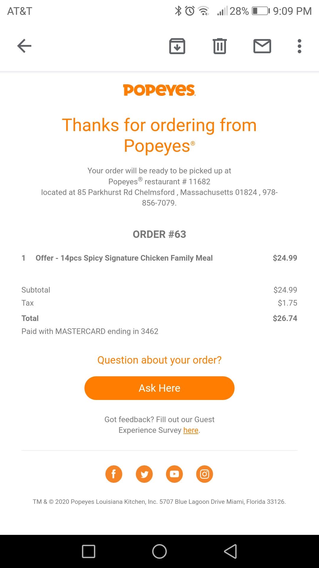Read moreI would NEVER go to a Popeyes again!! THE WORST Customer Service I have experienced. Went thru drive thru, was immediately greated by rudeness, asked to pull up to wait 10 MINUTES for my order...to have the same RUDE associate bring out my order of 2 fish and shrimp and say, " I gave you and extra chicken (In one oreder) cause unless you want to wait 5 more minutes for your fish TO BE DROPPED??..... I questioned her at the get go...I didnt want chicken and I paid for fish??? I've already been waiting 10 minutes??? but just went home with my food.......this is what I got home (and I have pics) ..... 2 BIG PIECES OF CHICKEN and an almost unrecognizable piece of fish and VERY LITTLE SHRIMP.....The 2nd dinner had 50% more shrimp and 2 pieces of fish....I went back to speak up. I returned the food and the receipt with the time on it, and was greeted with an even RUDER manager and an associate who started swearing obscenities at me....I was ignored for another 10 minutes while other customers were FORCED to watch (not to mention make immediate judgemento on what might be happening) the drama and the manager rang the register while the original employee took off to nowhere. They eventually gave me my money back. 2 HOURS later, after my fast food ordeal began, I left with no food and hungry....Im just a single mom who works hard with a very tight budget. I was just trying to treat myself to a very small treat on payday in a drive thru.... and it took 2+ hours of my time and I still ended up hungry?????? I WILL NEVER GO TO ANOTHER POPEYES EVER AGAIN.....AND I'm not quite done with this.....WORST CUSTOMER...
