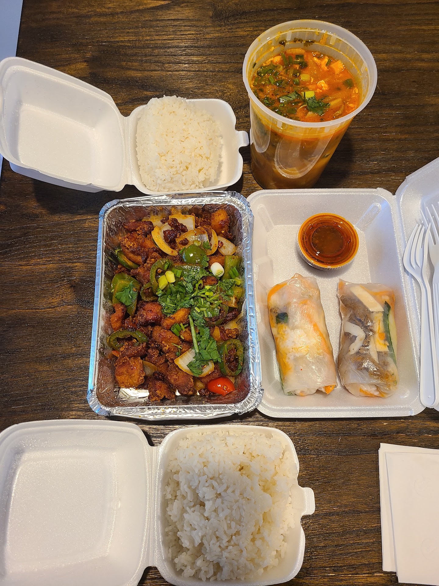 I will preface my comments to say that every restaurant has a bad service night so take my comments as you may. Servers were in total disarray (in the weeds) and took peoples orders before other customers who had been waiting for 20-30 minutes more. Others waited patiently for their checks to be delivered to the table. My sense is the parents are the cooks and the kids + a friend are serving and bussing the food. To make matters worse, the food came out in that order. My wife and I waited over an hour for our meal and right before it came out the server asked if our food had come out yet. The food itself was good, the spring rolls were very good but we got our meals about an hour after I ate the app so I suppose it tasted good but the meals didn't stand out. My wife had the bibimbap and it was fair to middle. Overall the food looks very good but I just wouldn't go there on a Sat night. They seemed inundated with takeout orders. The restaurant itself is fairly clean although the bathrooms were a bit below average. No paper towels in the Covid era?? Personally I would never go back but might get takeout if I knew I was going to be...