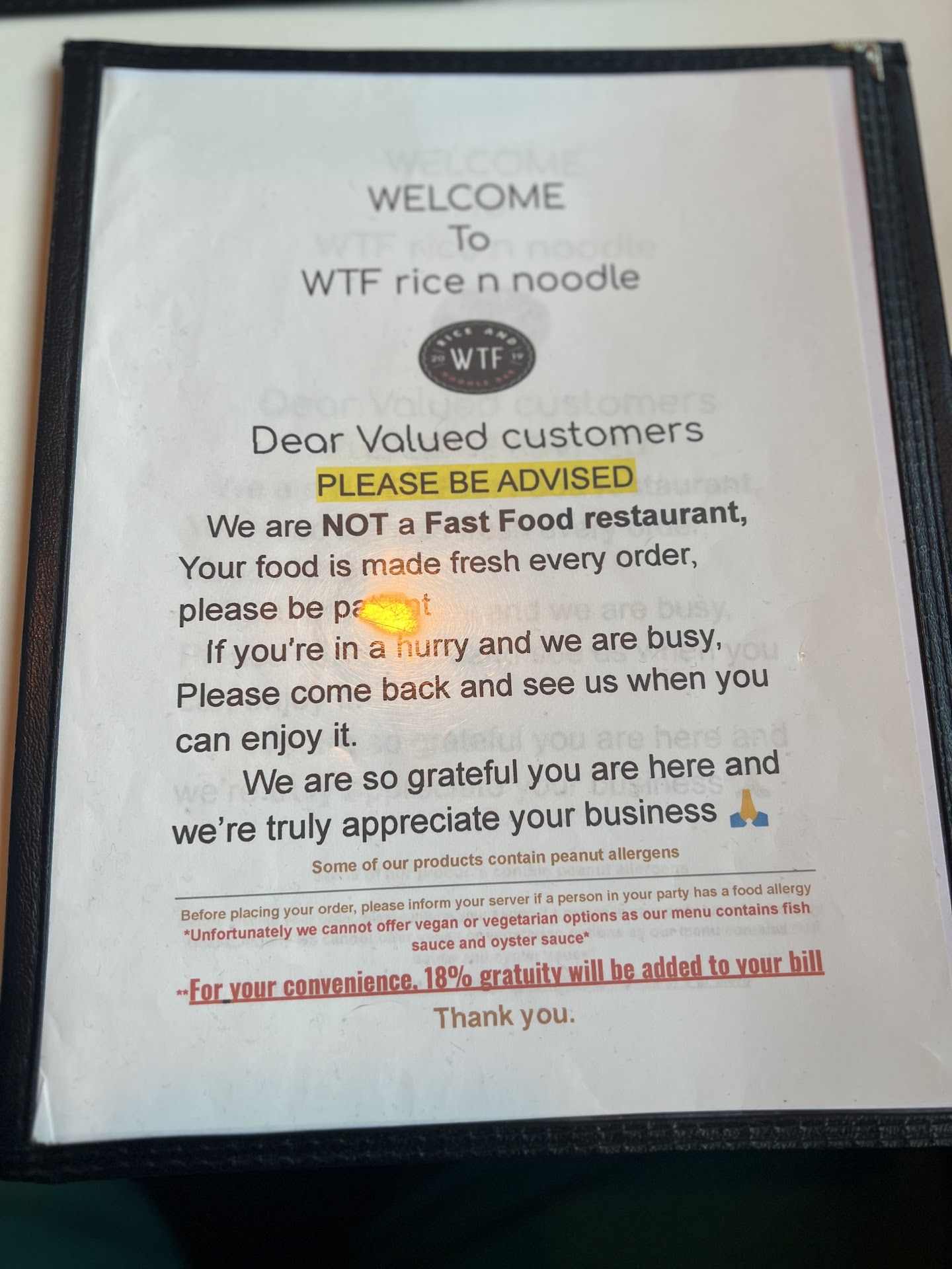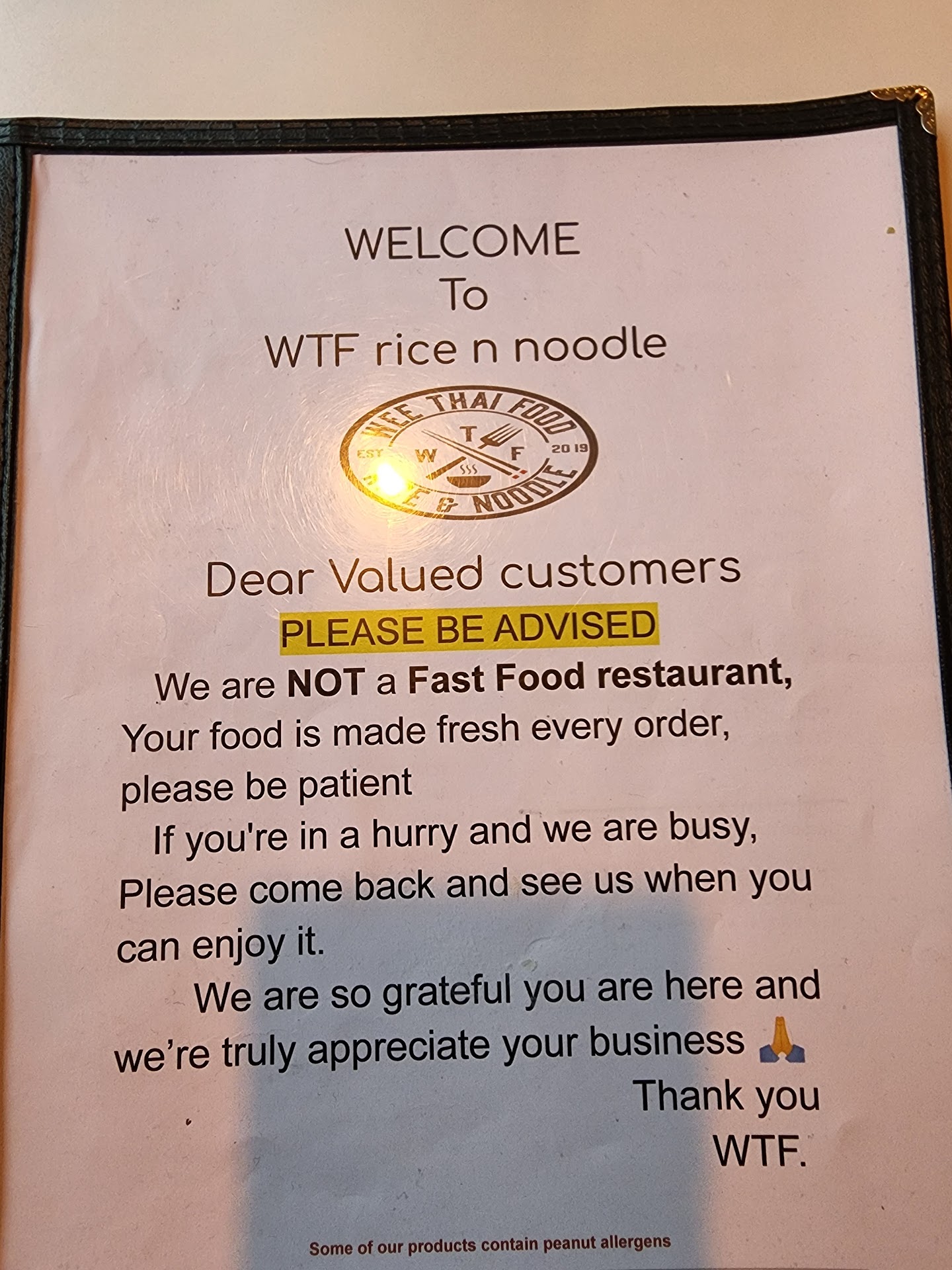 Read moreKhao Soi ($10.95). "Popular Northern style Yellow noodle in curry, chicken, boiled egg, red onion, pickles mustard sour." No choice of protein. I asked for it extra spicy, and it was spot on. The egg was cooked perfectly with an almost runny yolk. The pickles were excellent and tangy. The mustard sour was as expected. The noodles were either undercooked or pleasantly chewy, pick one. This was a surprisingly good Khao Soi. I'll be back to try more dishes from the somewhat limited menu. They took the order using a wireless card reader but went away to run the card. I thought this was a bit odd. Wicked flimsy napkins, please upgrade. Did they realize what the initials stand for?