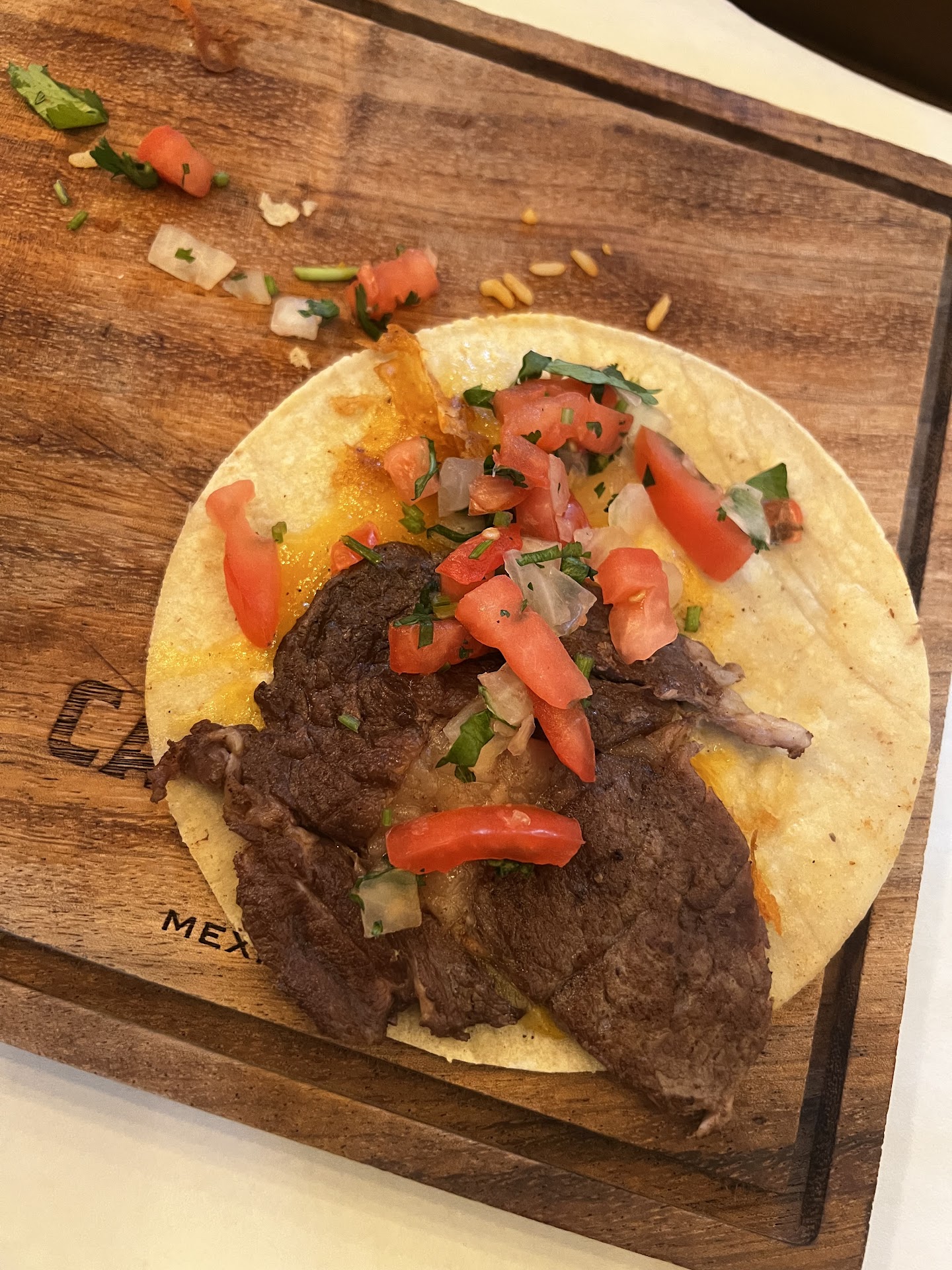 When the food arrived, it was a complete letdown. The rib eye taco was just a single slice of steak—not what you’d expect. The rice was cold, and the beans were bland and lacked flavor. Overall, the food did not meet expectations.
