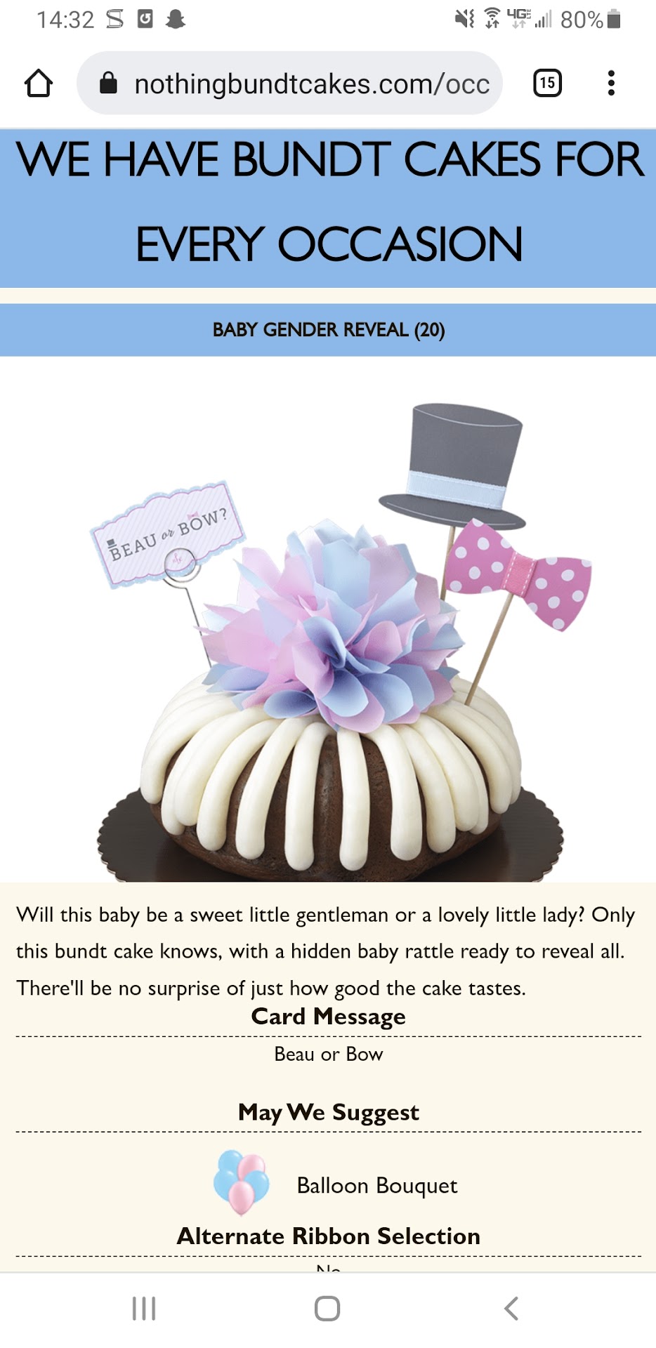 Read moreHad a lackluster experience today- called a few days ago asking about a gender reveal cake (Mom & Dad wanted to be surprised). The woman over the phone was really nice, and explained that they hide a rattle (blue for boy, pink for girl) in the center beneath a big bow. Was told that they could do something same day. Cool. Told her that we would stay local and would place the order that day and pick the cake up when it was ready. Got there early today (some time between 9AM-10 AM) and was asked to pick out a cake from the case. The girl at the front register said that they didn't hide or even have the rattle, which was surprising to me because I spoke with someone over the phone about it, and the website even says so! I was promptly handed the cake with the bow separately, and left disappointed. Husband & I ended up doing a little DIY to the cake for the gender reveal, and I think we'll go elsewhere next time we celebrate a special event. I definitely feel like I wasted $41 for a cake that I had to buy extra supplies for and wasn't even assembled...