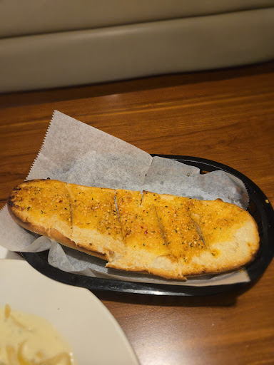 The garlic bread looked like someone took store bought bread and passed it off as restaurant quality. I'd suggest not leaving this in a loaf, but already seperated by the time it gets to the table. The cut marks were shallow, and if you are going to cut bread, cut it all the way.