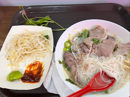 My husband and I came here looking to dine in. To our surprise, there were no tables. Just a small breakfast bar type of counter top with the most uncomfortable stools with metal backs that make it hard to squeeze into for a larger person. This place is clearly set up for take-out orders so do not come here to dine inside. Also, there was a line when we walked in so I ordered at the kiosk. I really wanted pho so I got it with steak and brisket. My husband wanted a marinated grilled pork banh mi, but they didnât have it on the menu, so he settled for the âcured red meatâ whatever that was. We shared a small taro boba tea. As we sat there and waited, our food seemed to have taken longer than the usual wait time that we would at another restaurant. When our food finally came out, a woman from the kitchen brought it out on a tray. She said she mistakenly took it to the wrong counter top. Hereâs the real verdict: the pho was awful. The broth was very sweet! Authentic pho should not taste sweet but savory. Also, there was way more noodle than broth, which is unfortunate because I prefer more broth. My husband seemed to like his sandwich but he is easily pleased with food. I am the food critic. The taro boba was fine, but the cup was very small for the price so youâre not getting much value. Also, the pho was $14, which is not worth it. Also need to mention that the meat was very tough and hard to chew. I ended up packing the rest to go, but they give you these thin, cheap plastic containers and that is a health concern because the plastic will leach into the foods. All in all, I would not recommend getting food here, especially the pho. I would just come here for the boba. I feel like I overspent and didnât get much...