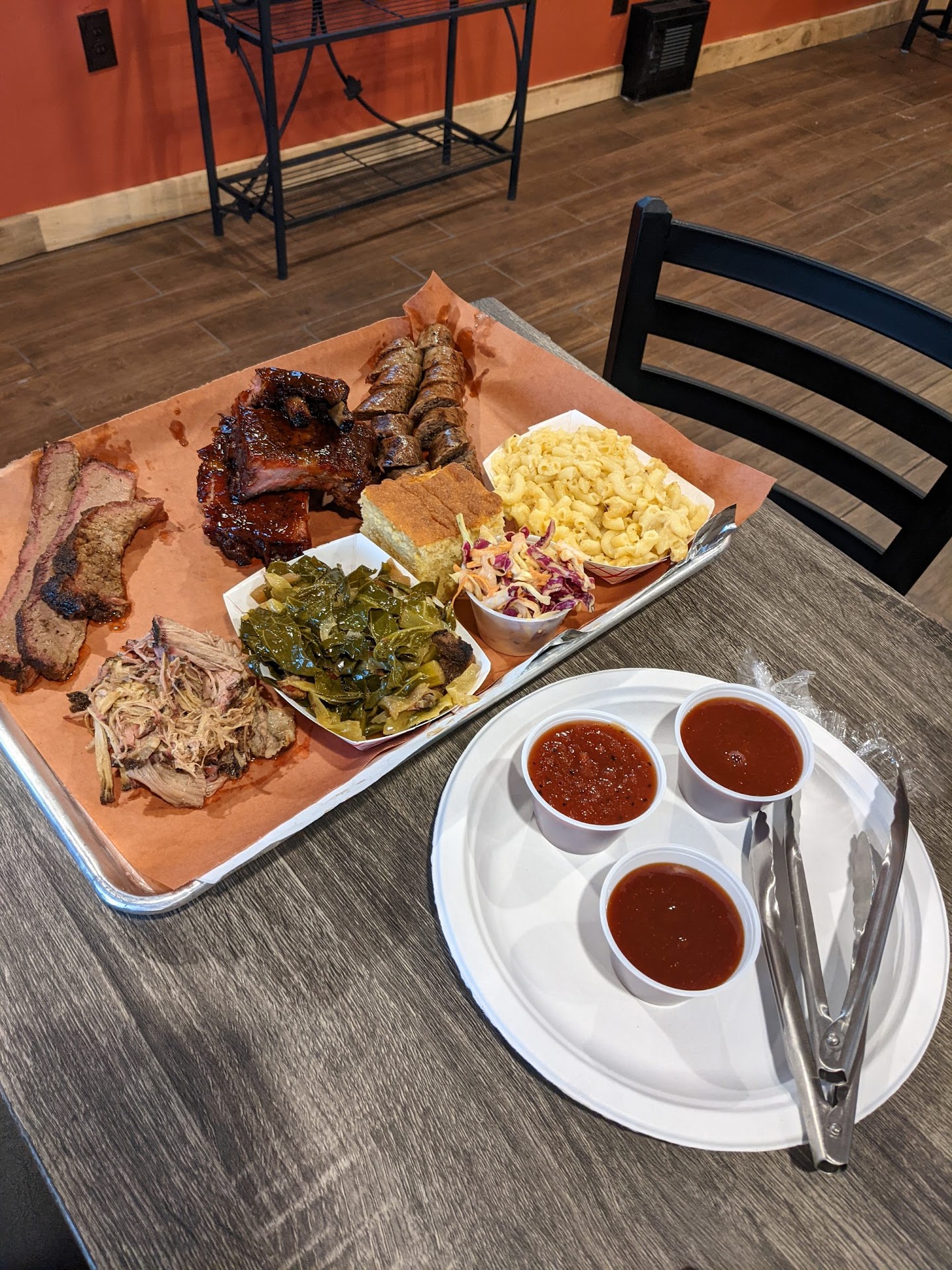 We ordered one of the entree platters that was listed as feeding 2-3 people. It included ribs, sausage, and slaw, and then we had the option to pick 2 more meats and 2 more sides. We picked pulled pork + brisket for the meats, and mac & cheese + collard greens for the sides. After a short wait, we were brought the tray shown in the picture. There were 3 barbecue sauces - house, a strawberry habanero, and an espresso infused (sorry to Up in Smoke if I got those wrong!).
