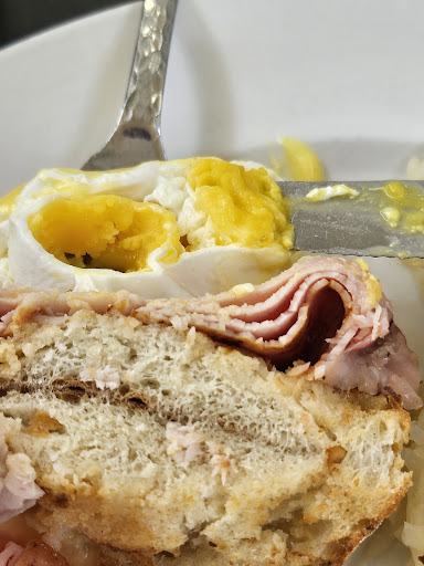 On this particular occasion of Easter Sunday 2024 when my wife and I came in to dine, I got a roasted pepper and goat cheese omelet while my wife got an ahi tuna sandwich. We also decided to get a stack of three chocolate chip pecan pancakes to split between the two of us. The food while plentiful, did need a lot of seasoning so we had to add for tabasco. That is something worth pointing out about Nudy's food; by default they will not add salt to their eggs and so it is entirely up to the customer to add salt, pepper, etc. per their own tastes. Once I realized that (after being informed by my hostess on a previous visit to their Phoenixville location), I have been more aware of the fact while dining at Nudy's and so on this particular occasion, I added salt, pepper, and tabasco per my own liking. Likewise, with my wife she had the need to add mayo to her bun because absent that her ahi tuna sandwich felt quite dry.