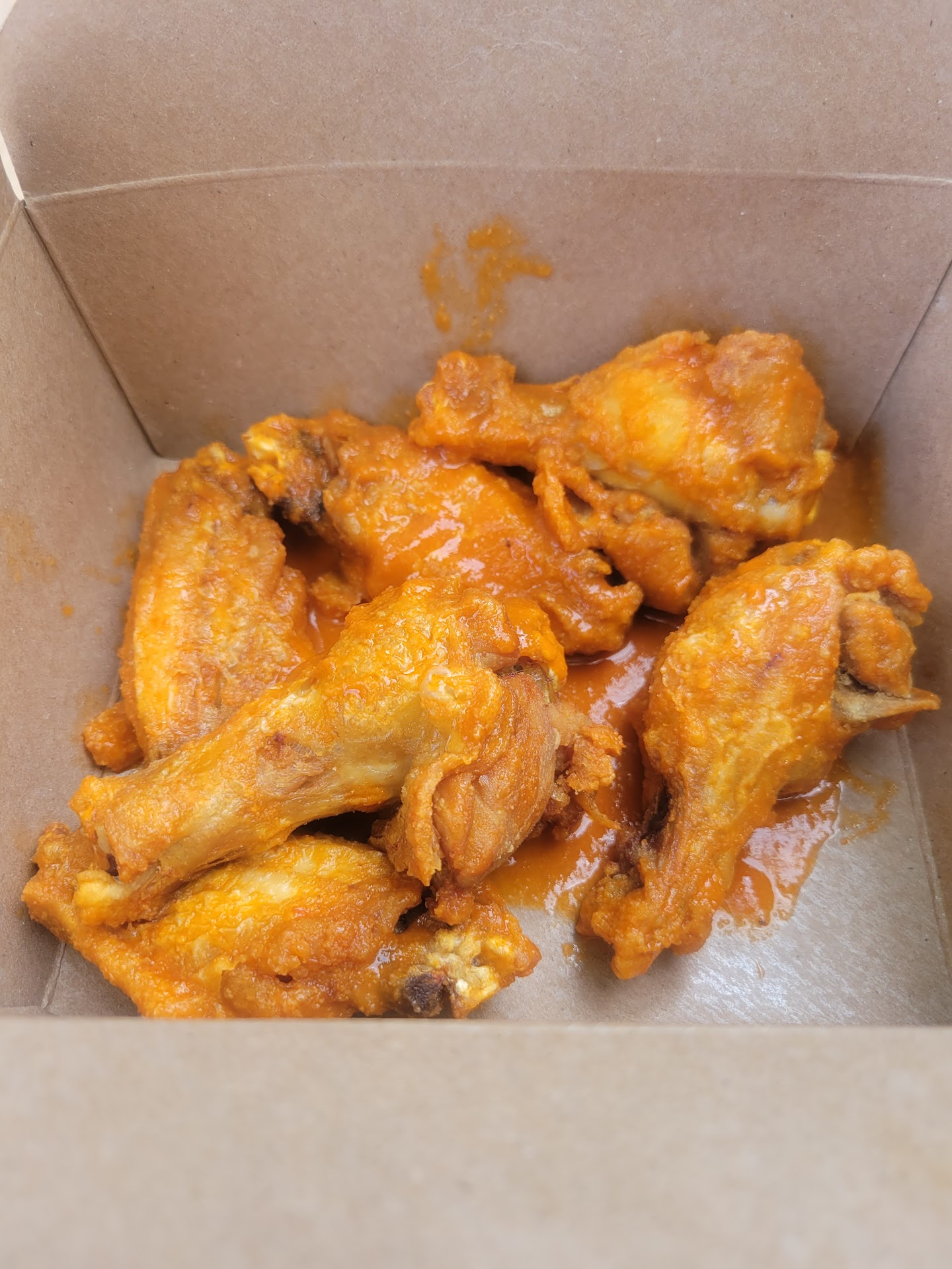 Read moreWings were really good. I got the honey Sriracha. Great size and well dressed. The burger was the lamest thing in the world. I didn’t know that it didn’t come with the normal things burgers come with. I looked through the reviews and saw a burger with lettuce and onions and tomatoes. Not sure where that was from because I didn’t see any other burger type on the menu. It could just have been me and I had to ask but normally burgers come with things and you ask to “hold” things. Anyway it really is a place where you “wing it” No seating inside or outside. The wall has their “no show” jail cell. Which I get but it just seems like they have problems with the general public I guess stealing from them since everywhere you turn there’s a camera that says “smile you’re on camera”. I would totally go back for the wings though. I would just go more prepared. Also the front counter girl was not happy or approachable. I think she’s probably annoyed that there’s no air in the place. Couldn’t care any less to be helpful it seems. But I get it your life’s work isn’t probably wanting to sell wings but hey smile...