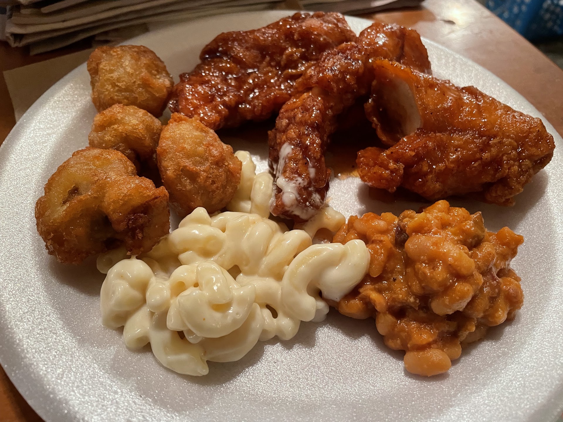 We were so excited to try this place on vacation this year and had a hard time deciding what to get because everything sounded so good. Our family of 4 got a wide variety of menu items and I can't honestly say a single one was good. The hot and spicy chicken sandwich platter was probably the best out of the lot, had all the right components, but the flavors just weren't there. Pulled pork, bland. Baked beans had good flavor but really gross texture of fatty pieces throughout the entire dish in a million pieces so it wasn't like you could even eat around them. My dad got a brisket sandwich and said he's had better from Wawa. Mac n' Cheese was fine but nothing special. Got multiple kinds of fries and they were so greasy they saturated the entire brown bags. Worst of all was the chicken tails platter. The chicken was so overcooked, we couldn't even chew/swallow it. We took them back because they were completely inedible, to find out they're fried in a big batch in the morning and then reheated when you order. The workers gave just about every excuse in the book, from people like them cooked like that to they were only dry because we got sauce on the side. Like c'mon. No excuse not to be frying chicken tenders fresh for every order when they take less than 10 minutes in the fryer. Overall, we were extremely disappointed and will not be returning unless there are some...