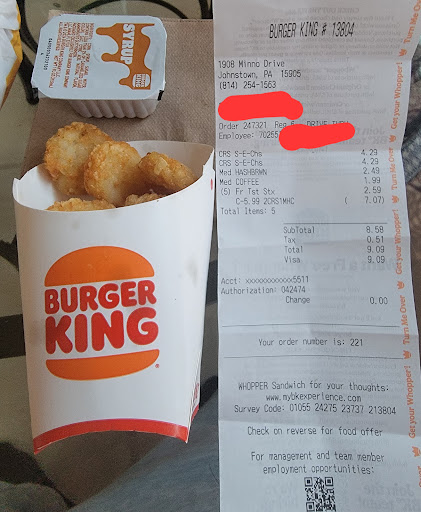 Normally we have pretty decent experience at this burger king. We usually come to let my kid play in the play area, get fries, whatever. Its "fast food" so you expect just that. Today we go in my boyfriend and daughter go straight to the play area. I order almost immediatly. 2 breakfast sandwiches and an order of cheesey tots, and an ice water. Simple enough. I got my water and waited. And waited...and waited. I started to become frusterated when people were ordering and I was watching the workers take parts of my order off my tray and give them to the drive thru and other customers. Im 6 1/2 months pregnant and it was pretty hot. I got tired of waiting. I went and asked my boyfriend to wait in my place. He came back and said they'll bring it out. Fine. After 13 minutes (accordingng to the slip) they bring 2 sandwiches. We start eating them. Still no cheesey tots. I ask my boyfriend to go cancel the order and just get the cash. He goes out and comes back a minute later with cheesy tots. 17 minutes after ordering them. I could have ordered a pizza. Also, music was blasting so loud in the kids area I literally got head ache. Just why? Yeah awful experience. My kid had fun though. Idk maybe dont go to burger king on...