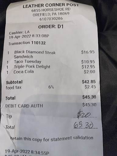 Read moreI frequent the Leather Corner Post on a relatively regular basis. The food is excellent for bar food, I've never had a meal that I didn't enjoy. The wings are juicy and delicious, and a good size- not those little one-biters that some places serve. It's a mix of clientele, young people, local "rednecks" and the more well off, just a group of regular people where everyone feels at home. Everyone is friendly, and the bartenders are on top of things. There is usually something going on, a band, trivia, karaoke, open mic, etc. It's always a...