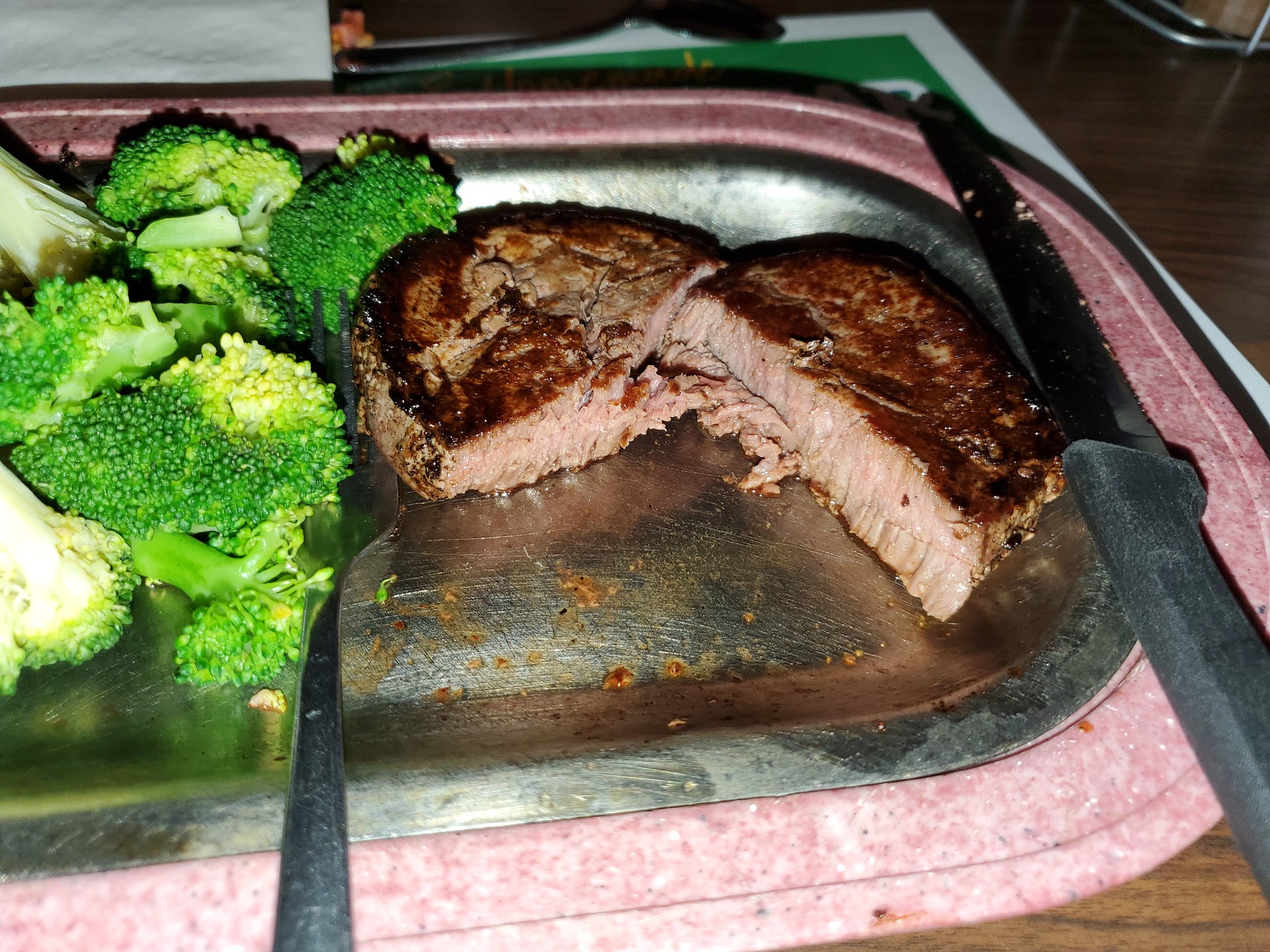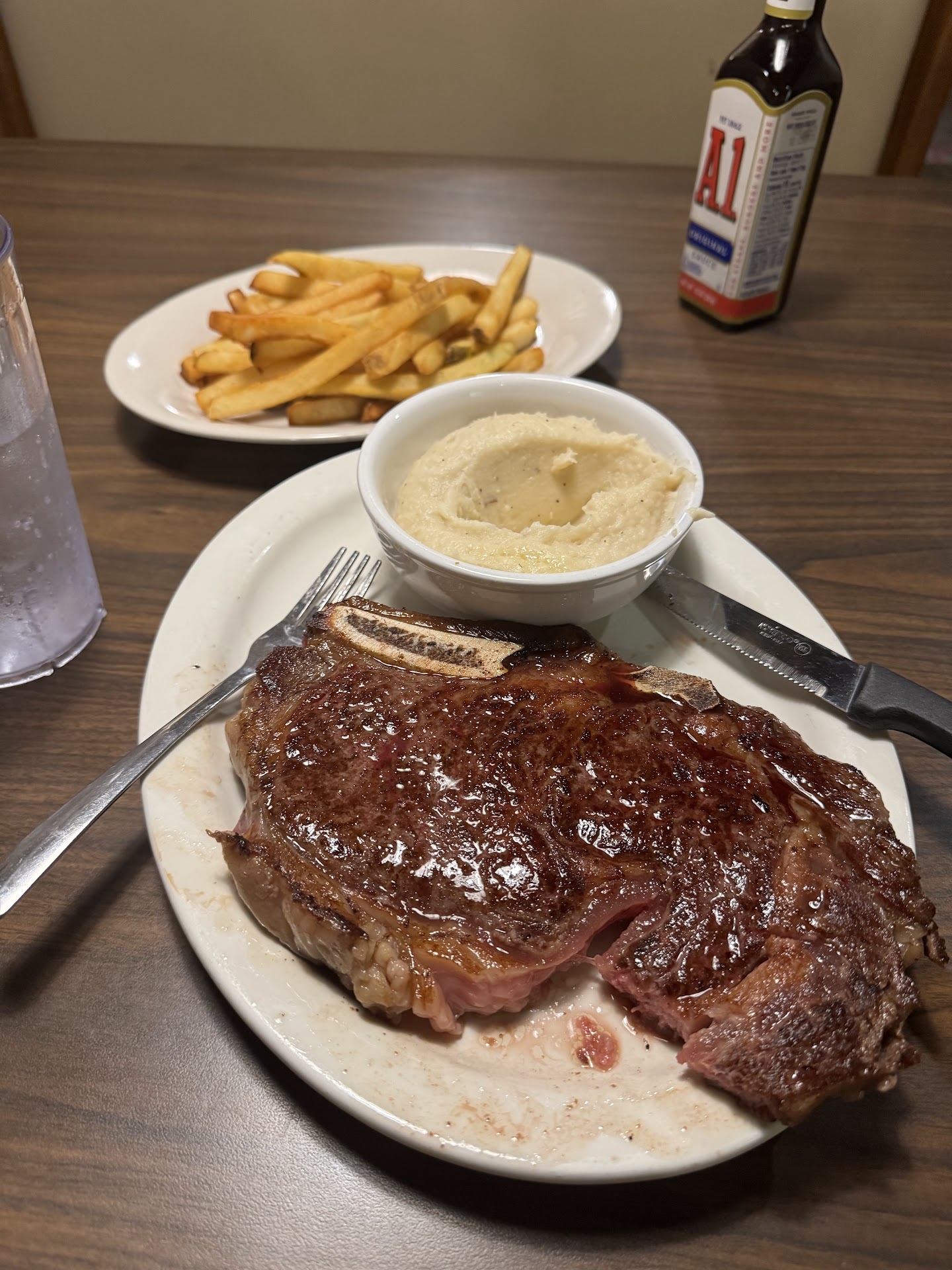 We ordered our steak entrees. One Kansas Strip (Pittsburgh rare), one 6oz sirloin(medium), one tip platter (med rare). All the meat came over cooked. Tips are tough not to overcook so I didn't send that back-we didn't send anything back, but it was disappointing, but I didn't have the heart to make the chef redo tips. They aren't worth it and I was there for my husband anyway. He wanted and specifically asked for a cool, red center. No dice. Ended up coming out medium and the platter they put it on remained so hot throughout the meal that he ended up with a steak well done, sliced at an odd angle so that the bone was the thickest Part.