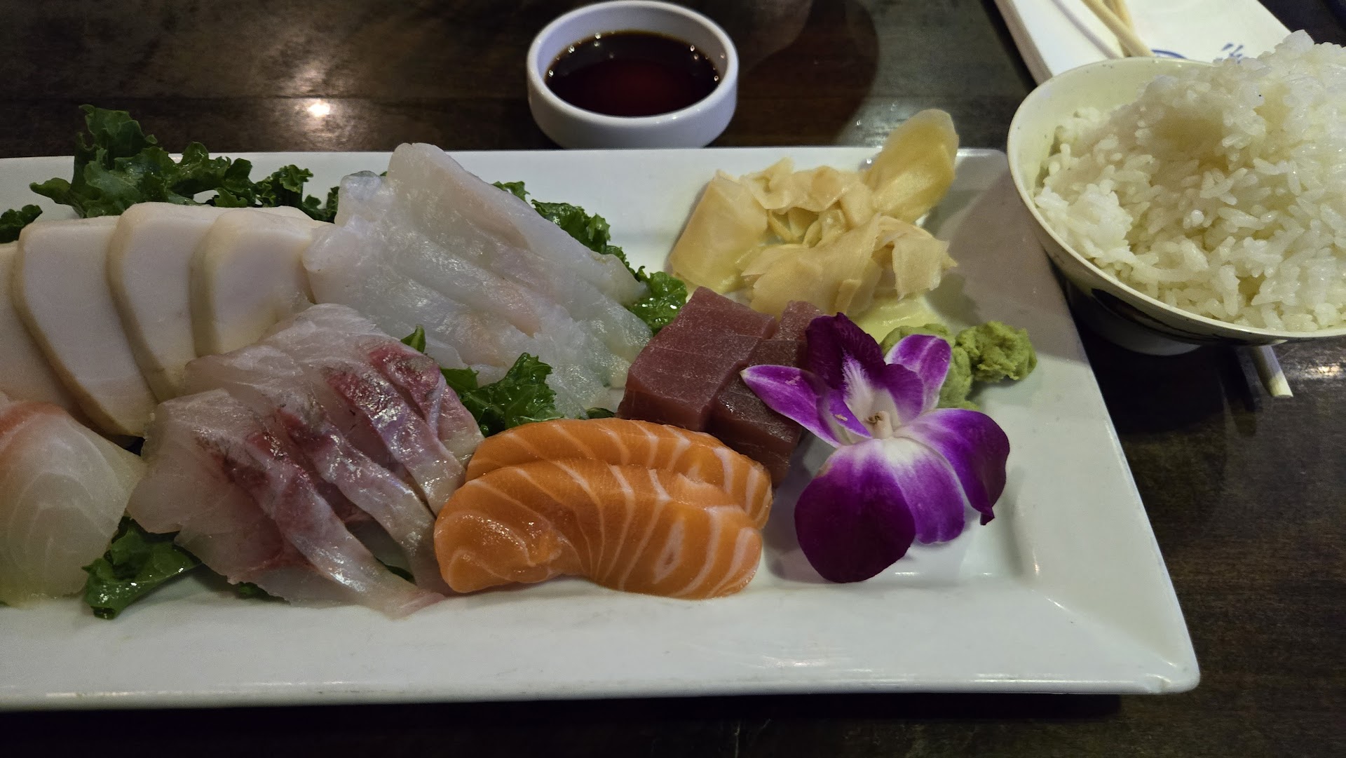 The Sashimi Dinner consisted of 20 pieces of fresh fish (including salmon, tuna, white fish, yellowtail, and red snapper). It was beautifully plated and served with a bowl of sushi rice.