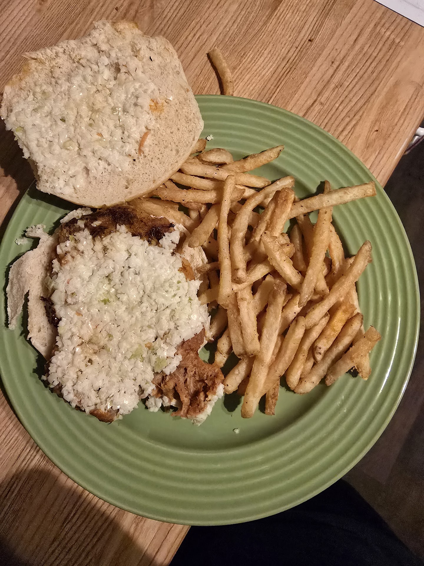 The other mains were the Buffalo chicken salad, which was recommended to us by our server and was kind of disappointing. It was a chopped salad that was on a flatter plate, which is not the correct vessel for a salad of that size. Then knight burger was cooked well and had good seasoning with house fries. Then the last was ham tailgater with the works minus the peppers. All were good mains except the salad because of the plate and the fact that it's a chop salad, so trying to stab with a plastic fork isn't...