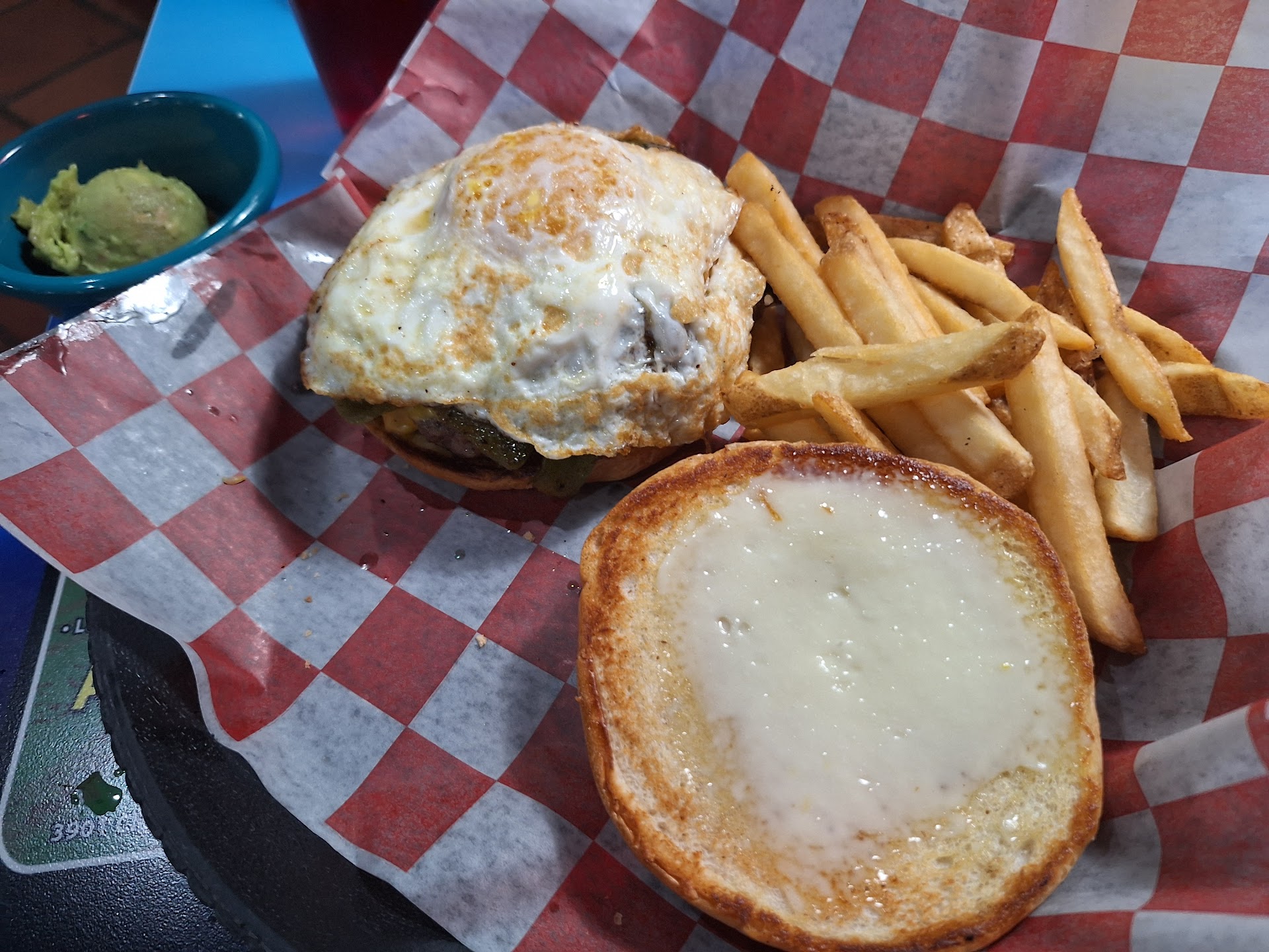 transfer the food for the price got a giant burger with green peppers jalapenos fried egg some of their special sauce and a couple other fixins along with plenty of chips and a variety of hot salsa and green salsa it's all hit the spot for reasonable price for the whole family