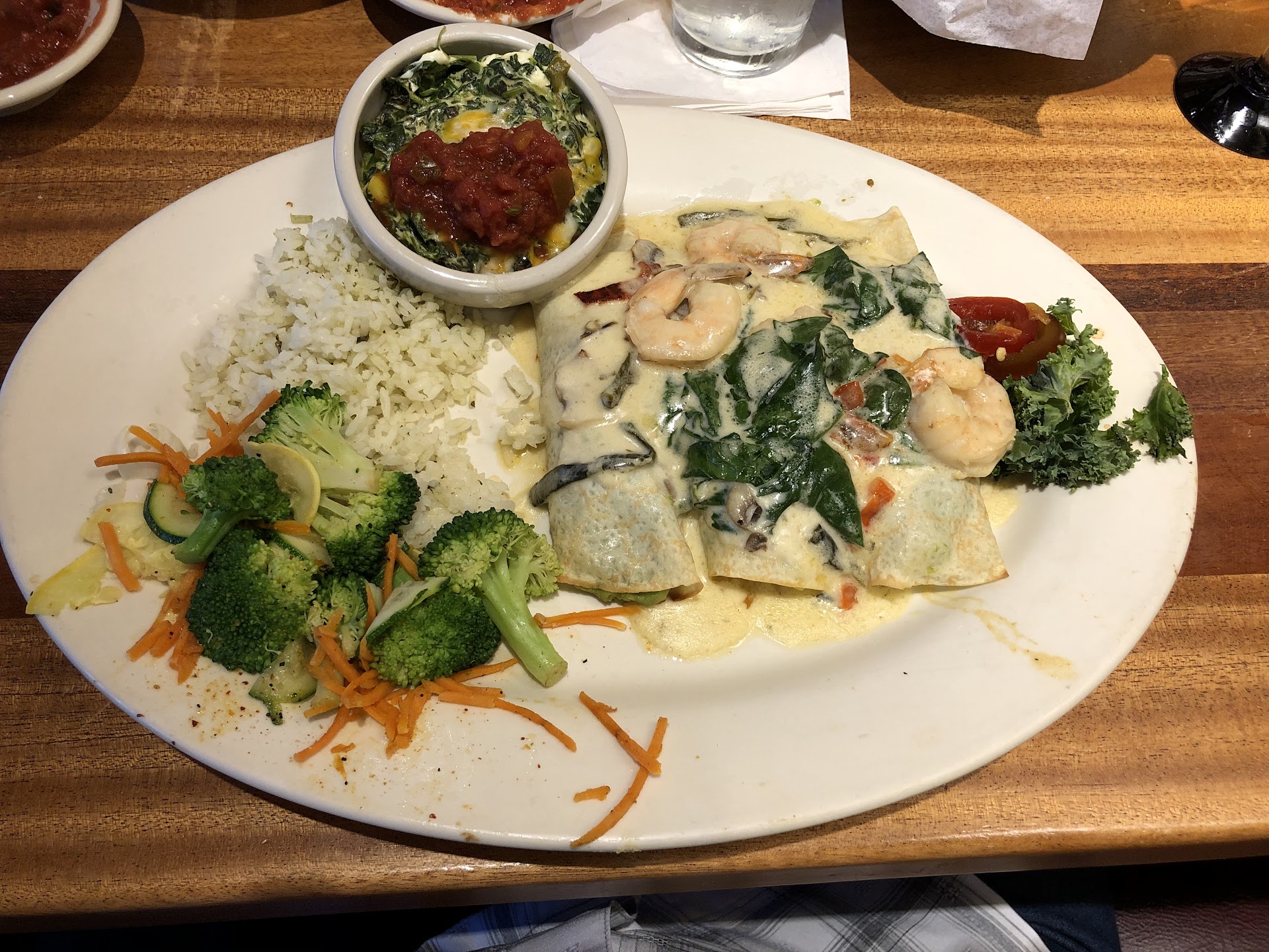 We had fajitas. My wife's shrimp and my veg fajita had no sizzle when served. Must have been sitting in kitchen before brought out to us or they just did not do it correctly. My veg fajitas had 3 small brocolli crowns, slopped on noodley soft overcooked onions, and a few small mushroom slices for 15 dollars. They were so saturated in butter, that is all I could taste. Came with three room temp tortillas similar that one would buy in supermarket. In 64 years, these were the worst fajitas I ever had in my life (veg or meat).
