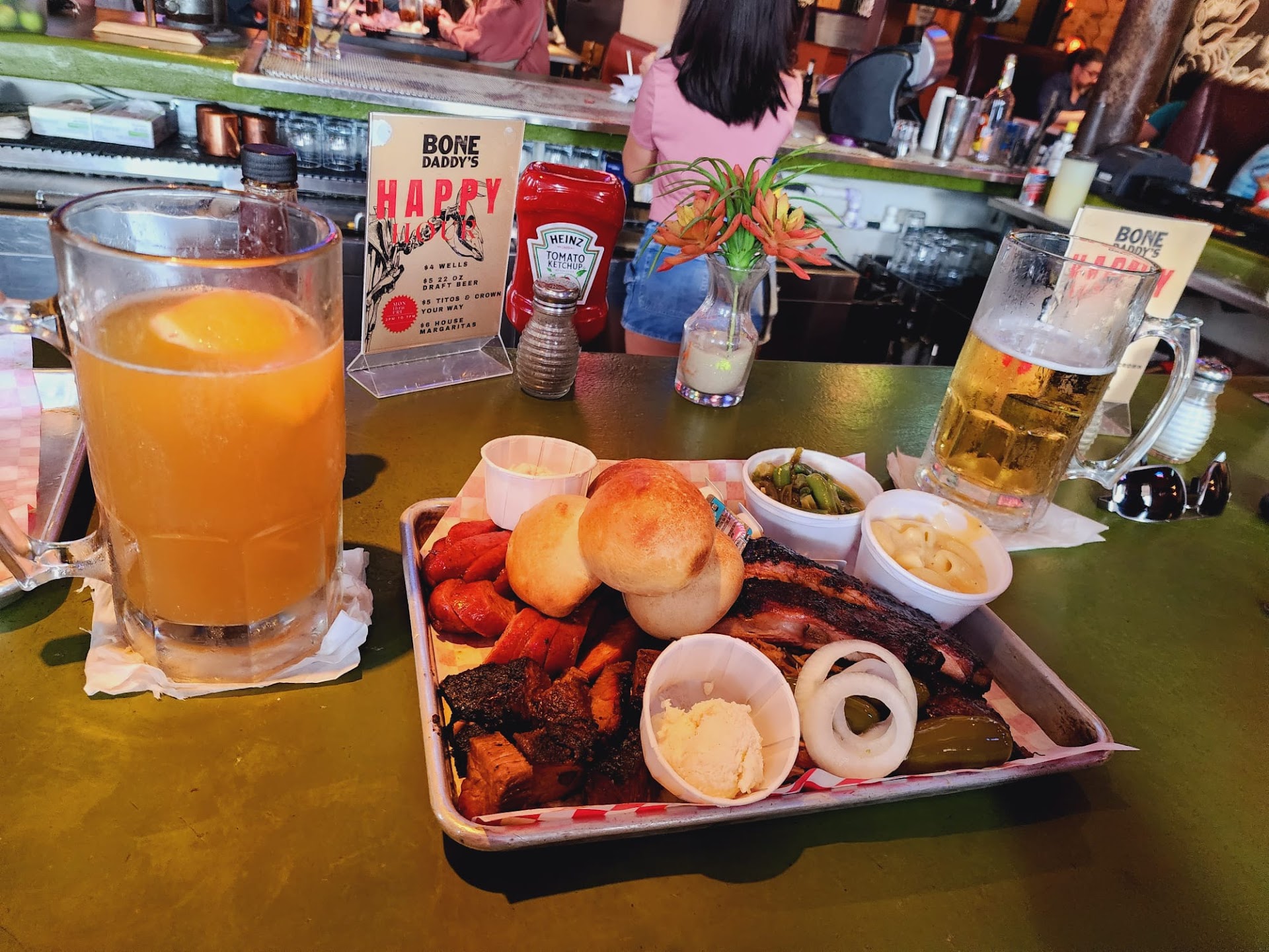 Read moreHear ye, hear ye! I, Sir Larry the Scribe, have been tasked with penning a review of the establishment known as Bone Daddy's BBQ, located in the bustling town square of the lbk. Let mine words be a testament to the wonders that await those who venture through its doors.As I approached the establishment, the tantalizing aroma of smoked meats and sauces most divine wafted through the air, beckoning me forth. The exterior, adorned with the visage of a mighty bone-wielding figure, promised a dining experience unlike any other.Upon entering, I was greeted by the fair Megan, the manager of this fine establishment. Her countenance was warm and welcoming, and she guided me to a table with haste. The interior was adorned with the spoils of the hunt, from the antlers of mighty stags to the bones of fearsome beasts, all arranged in a manner that spoke to the primal nature of the cuisine.Ere long, the fair Meghan, the bartender, arrived with a tankard of the finest ale, brewed to perfection. The foam atop the amber liquid danced with each sip, quenching my thirst and preparing my palate for the feast to come.And a feast it was! The menu, scribed in the most elegant of calligraphy, offered a veritable cornucopia of smoked meats, each more tantalizing than the last. I, being a man of discerning taste, opted for the "Bone Daddy's Platter," a veritable mountain of ribs, brisket, and sausage, all cooked to perfection.The first bite was a revelation, the meat falling from the bone with the slightest of touches, the flavors dancing upon my tongue in a symphony of savory delight. The sauces, ranging from the sweet and tangy to the fiery and bold, provided the perfect accompaniment to each morsel.As I savored each bite, I could not help but marvel at the skill and dedication of the culinary artisans who had crafted this feast. The tender care with which the meats were prepared, the perfect balance of spices, and the attention to detail in the presentation all spoke to a level of mastery that is rarely seen in our humble town.Alas, even the mightiest of appetites must eventually be sated, and as I leaned back in my chair, I could not help but feel a sense of both satisfaction and longing. For I knew that I would soon have to depart this establishment, leaving behind the wondrous flavors that had so captivated my senses.In conclusion, I can say with the utmost certainty that Bone Daddy's BBQ is a true gem in our community, a bastion of culinary excellence that is not to be missed. Whether you seek a hearty meal to fuel your day or a delightful dining experience to share with friends, this establishment is sure to leave an indelible mark upon your palate...