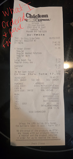 Read moreI went to Chicken Express to get our Evening Meal last night! The line was to the entrance but I would not have been in the street - so I entered! After over an hour of waiting in line I did receive a meal at the window! The meal I had ordered was $35.00 plus! But when I drive back home it certainly was void of several items! When I called to complain I asked for the mgr and the girl said she was the mgr snd what was the problem! She was very rude, hateful snd was not willing to LISTEN to the complaint! BUT wanted to accuse me if just complaining about her employees and there were doing a gd job! When you sit in line for one hour - receive about half your order ( that you will have driven over 25 miles to get and return home with it and spend your social security on it snd it was to be the âTreatâ for the month!!!!! NO UT WAS NiT! I rn outage you yo double check your order EVERY TiNE! They are not willing to listen to a problem that needs to be...
