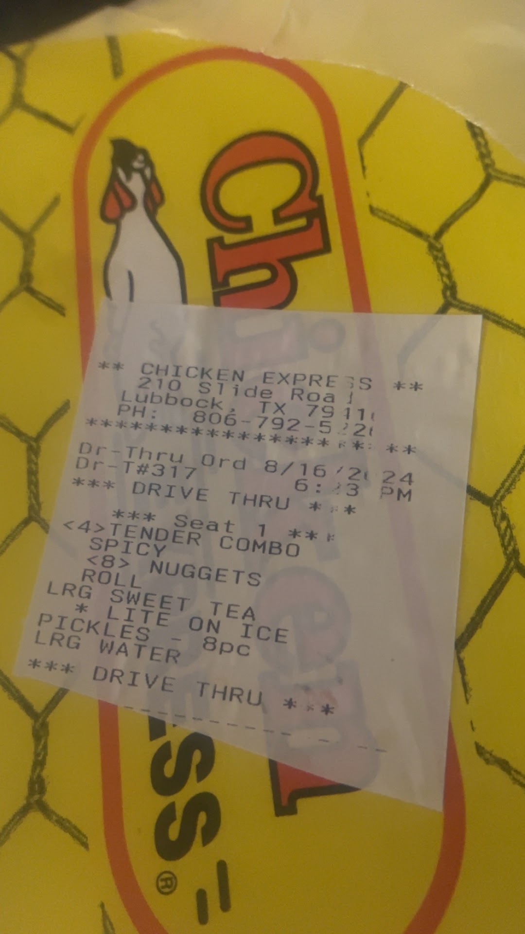 Ā Ā Ā Read moreI gave Chicken Express one last chance. They disappointed me again and for the last time. The chicken has no seasoning. No salt or pepper, nothing. That is just basic cooking 101. Once food is cooked without seasoning you can't really add anything to make it taste good. I went at 6:27 p m and ordered the 12 piece mixed, just the chicken with no sides through the drive through. I should have looked at the food before driving away but I didn't. I live 30 miles away and when I arrived home and opened the box I realized the chicken looked old and overcooked. My family and I tried to eat it but it was too hard and actually cracked when biting into it. We ended up throwing it away. I used to love Chicken Express but in the last few years it has changed and not for the better. The service has also declined throughout this timeframe. When complaining about the food I get attitude and no acknowledgement of crappy food and service. I looked at the receipt and was going to call to get a refund but I saw at the bottom of the receipt the following statement. "We are proud of the products we offer. Any issues with our products require a receipt and the product returned in order for us to resolve the issue." I had already thrown the food away and I could have taken it from the trash and took it back to the restaurant but was actually fearful of them trying to sell it to someone else. I wasn't going to drive back to Lubbock and just looked at my charge of $33.43 as a lesson finally learned and a goodbye to Chicken Express for good. The location went to is located at 210 Slide Road but I have gone to the other one off University avenue and 82nd street and the one off 82nd and Milwaukee just to compare and it all sucks. Goodbye Chicken Express, I will miss your jalapeno poppers...