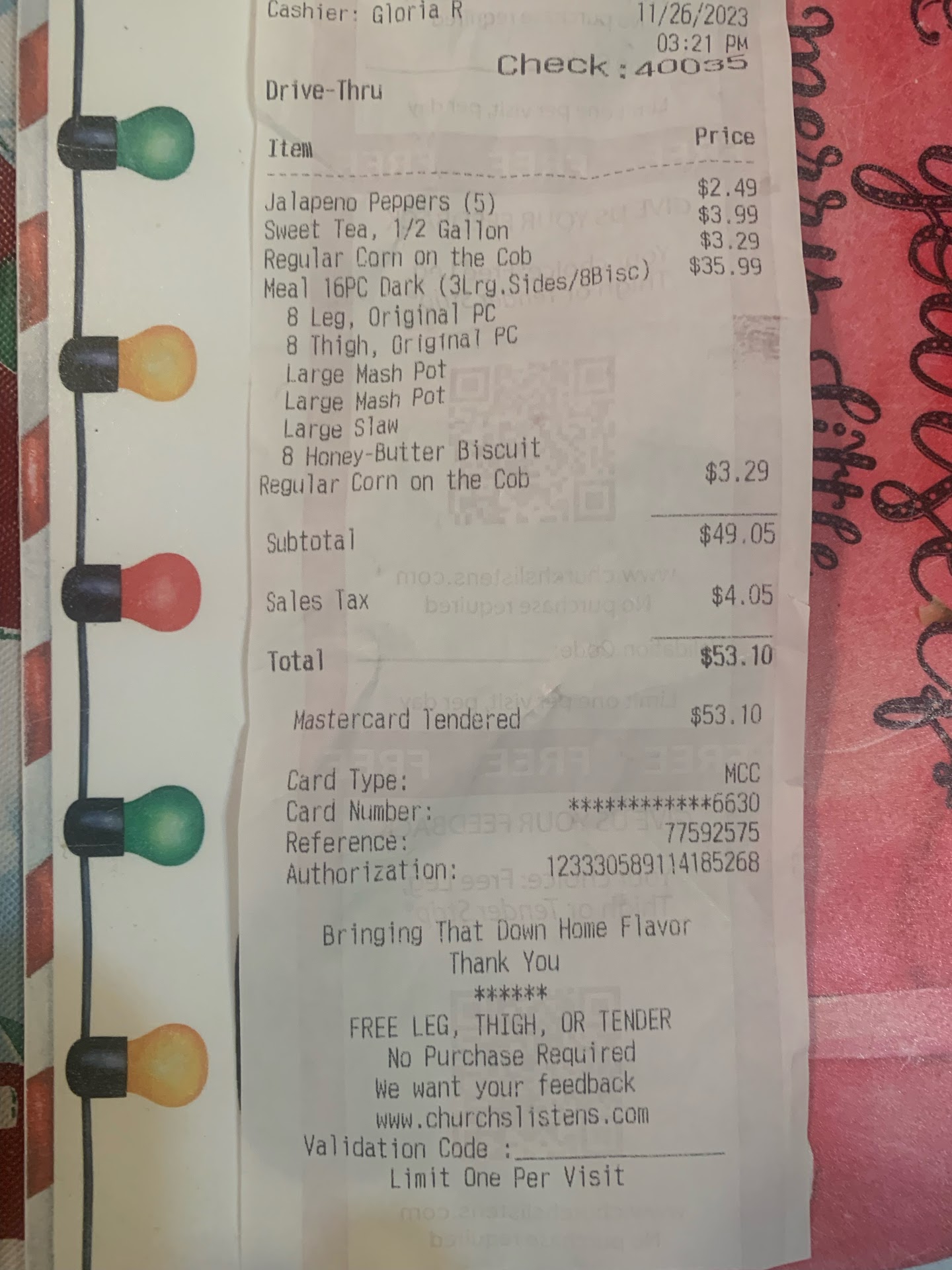 Read moreMy fiancé & I happened to be on this side of town on Friday & wanted some chicken so we stopped here. We spent over $30 on just 2 meals. When we got home I was absolutely disgusted by what they had given us. Our chicken was so hard that you physically couldn’t bite in to them. It was sooo old. The fries tasted as if they had been sitting since yesterday. The okra was literally crumbs of crust. Mind you we went right after lunch time so you’d think the food would have been somewhat fresh. I called to speak to the “manager” who stated her name was Destiny. I told her how awful the food was & that I couldn’t believe they were even ok serving this to ppl. I asked her as a manager what she would do to fix this & she ran me in circles. First it was she would put my name down to come back in the next 2 weeks & they’d remake my order. Then she switched to say I had to come back, bring the food & id be refunded. She sounded like a child & asked me not to be “mean” to her lol definitely didn’t seem like someone they’d want in a management position. what a joke. We just took our loss with it cause we lived on the other side of town but 100% will never...