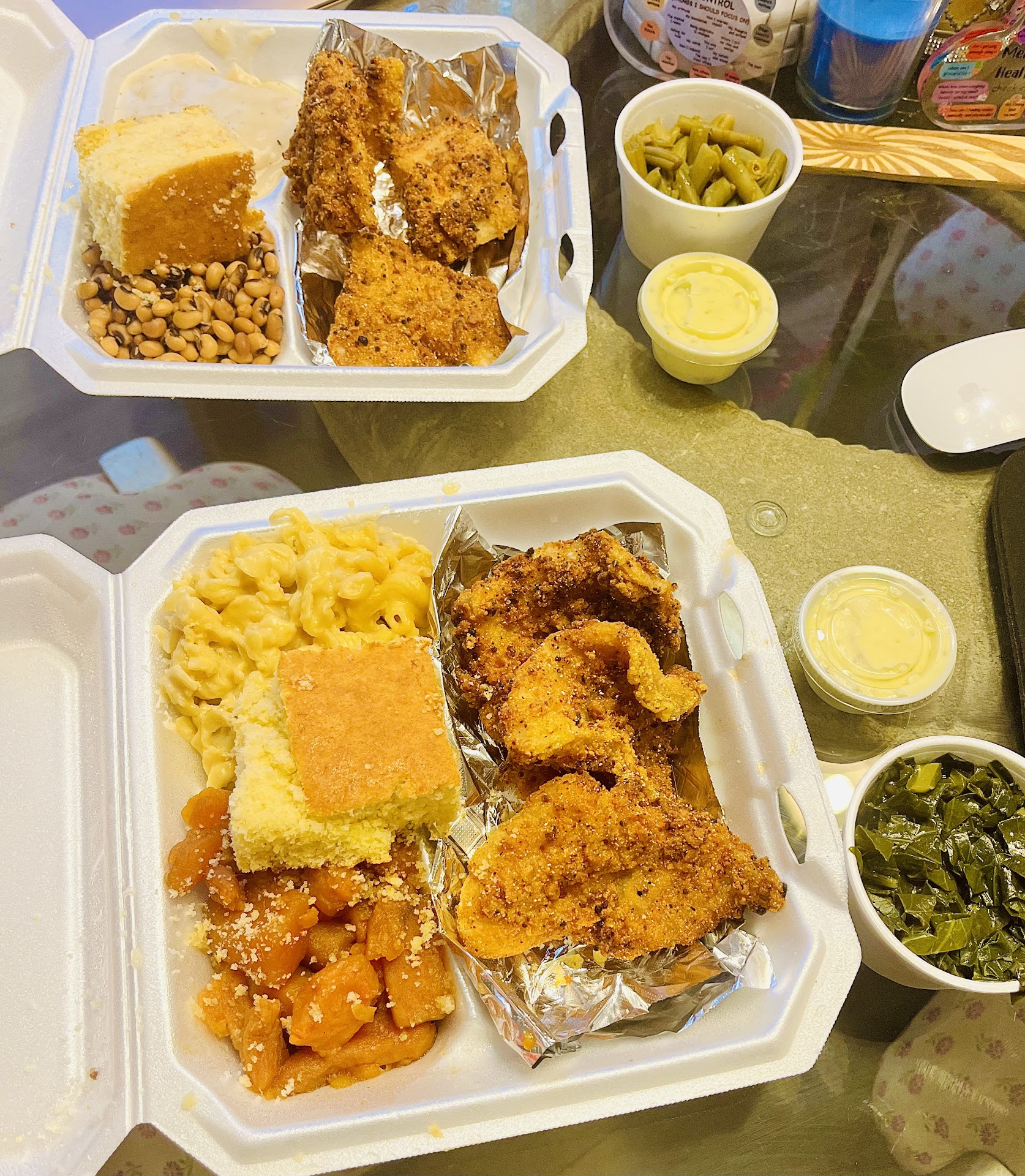 The Bad: 1. Majority of the sides were extremely bland. 2. The Mac and cheese was overcooked and didnât really have a cheesy taste. 3. The greens were coldânot like warm, but actually cold. 4. The fish was the most disappointing because it didnât even look like what I have seen in other customerâs pictures. The fish was very salty and was cooked too fast, yet had a little of burnt look on the exterior. It had multiple bones even though I specifically asked for fillet.