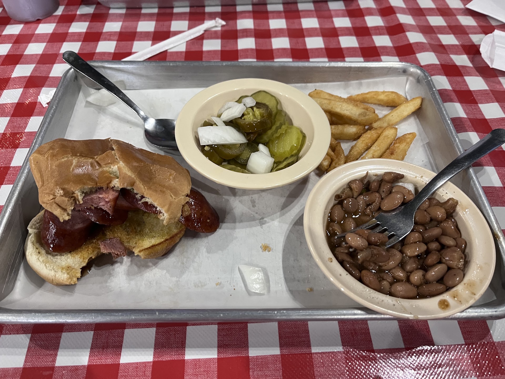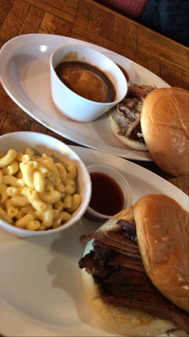 When you walk in, you think you would order from the counter, but you actually order from the menu at a table. You do not get to see the meat cut in front of you. I ordered the three-meat with moist brisket, pork ribs, and German sausage. The sides I got were coleslaw and macaroni and cheese. The Certified Angus Beef logo was displayed everywhere on the menu so I assumed that they were using a better brisket. They were better off using a lower grade of beef. I ordered fatty and got lean. The waitress charged me for a quarter pound of moist to get my order "right." It was like eating dry pot roast with smoke for both types of brisket. There was no bark and the fat was rendered away and/or trimmed away. The moist fell apart when I picked up a slice. As you can see below, I ate everything but both cuts of brisket. The pork ribs were solid. The dry rub combined with the smoke made them tasty. The ribs were very tender. The commercial sausage was just okay. You could probably find something similar at the grocery store. Nothing special to note about the sides, but I did eat it all because I was hungry.