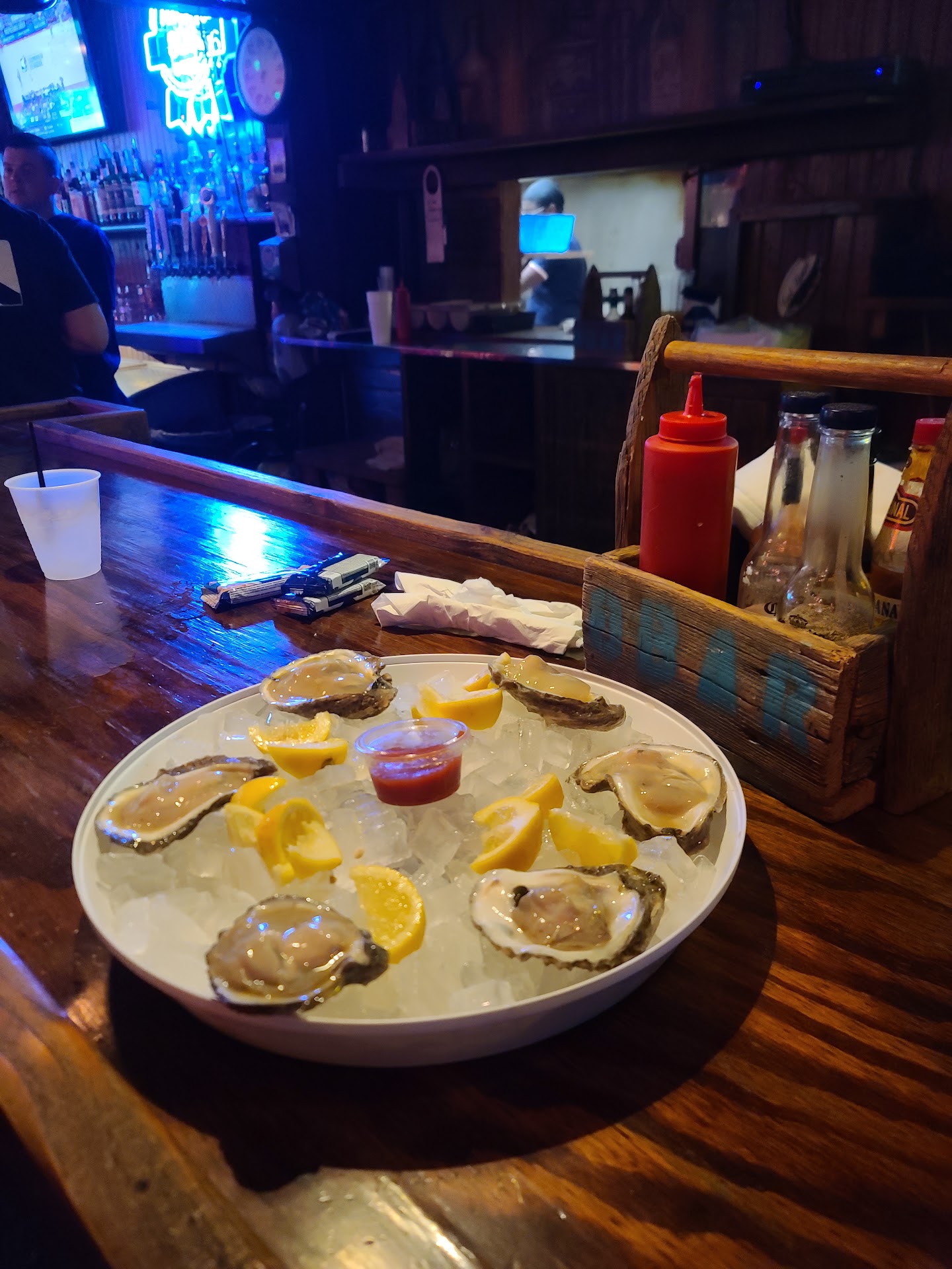 Read moreIt’s a neat little hangout spot, for the most part. A little hole in the wall/dive bar, The main area allows smoking, so unless you like being in that environment it’s a little gross. Food is pretty decent, they get fresh oysters on Wednesdays and they’re alright, the ones from the Texas coast tend to be large but bland. Drinks are pretty solid, but service is pretty rough. I’ve definitely met a few guys here and there that have good service, but I’ve also seen a lot more of poor service when I’ve been there. From bartenders cussing out customers for ordering oysters because they have to be shucked, to a certain female server we frequently see so busy flirting with old drinking regulars that she neglects her other customers, I would say service could use a boost in organization and professionalism. It also does get pretty loud in there, which isn’t a problem but it’s worth noting to see if it may be your...