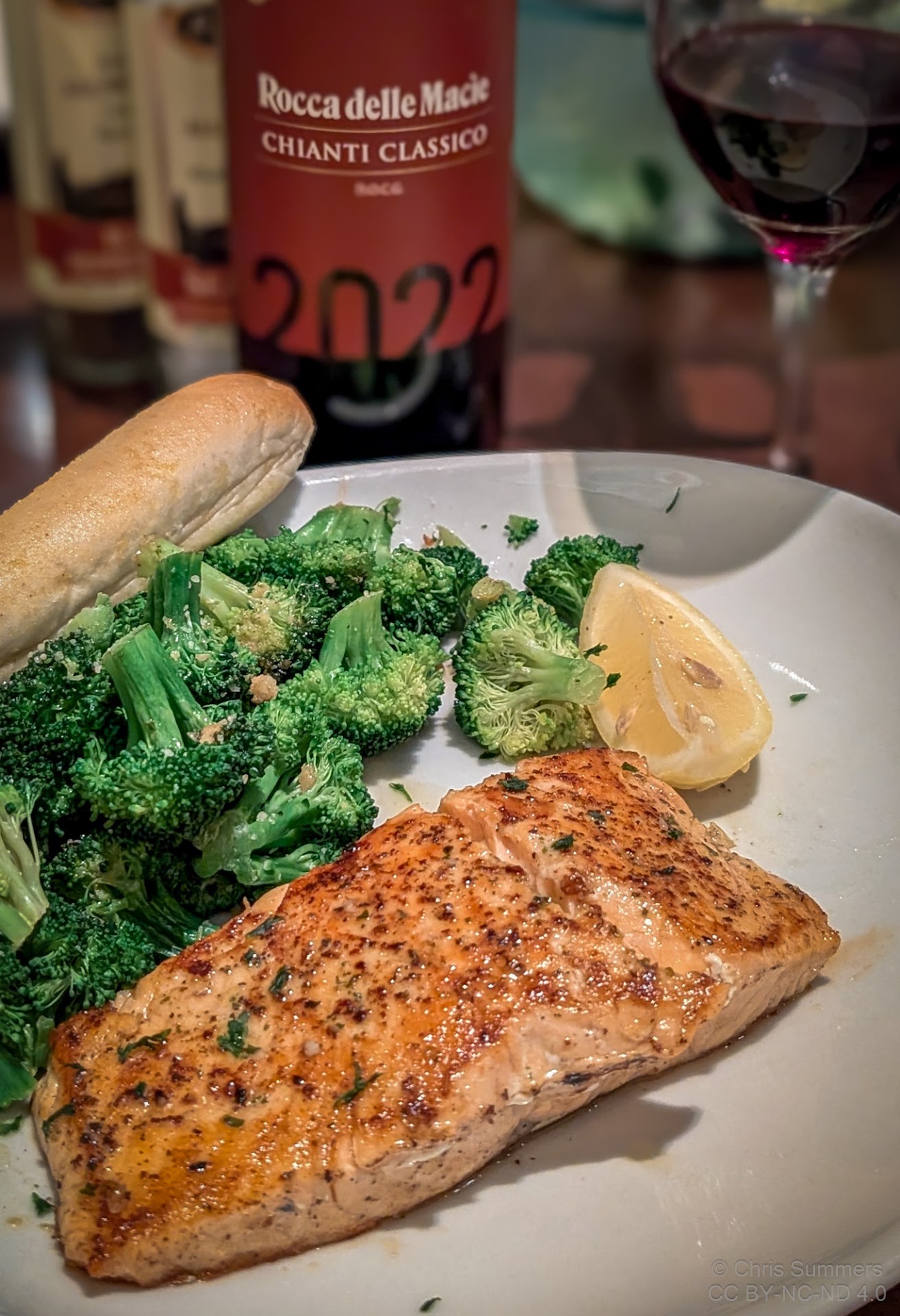 The entrees came, my wife had the meat tomato sauce over angel hair pasta and I had the grilled salmon and broccoli. It was all good, nice and hot and fresh.