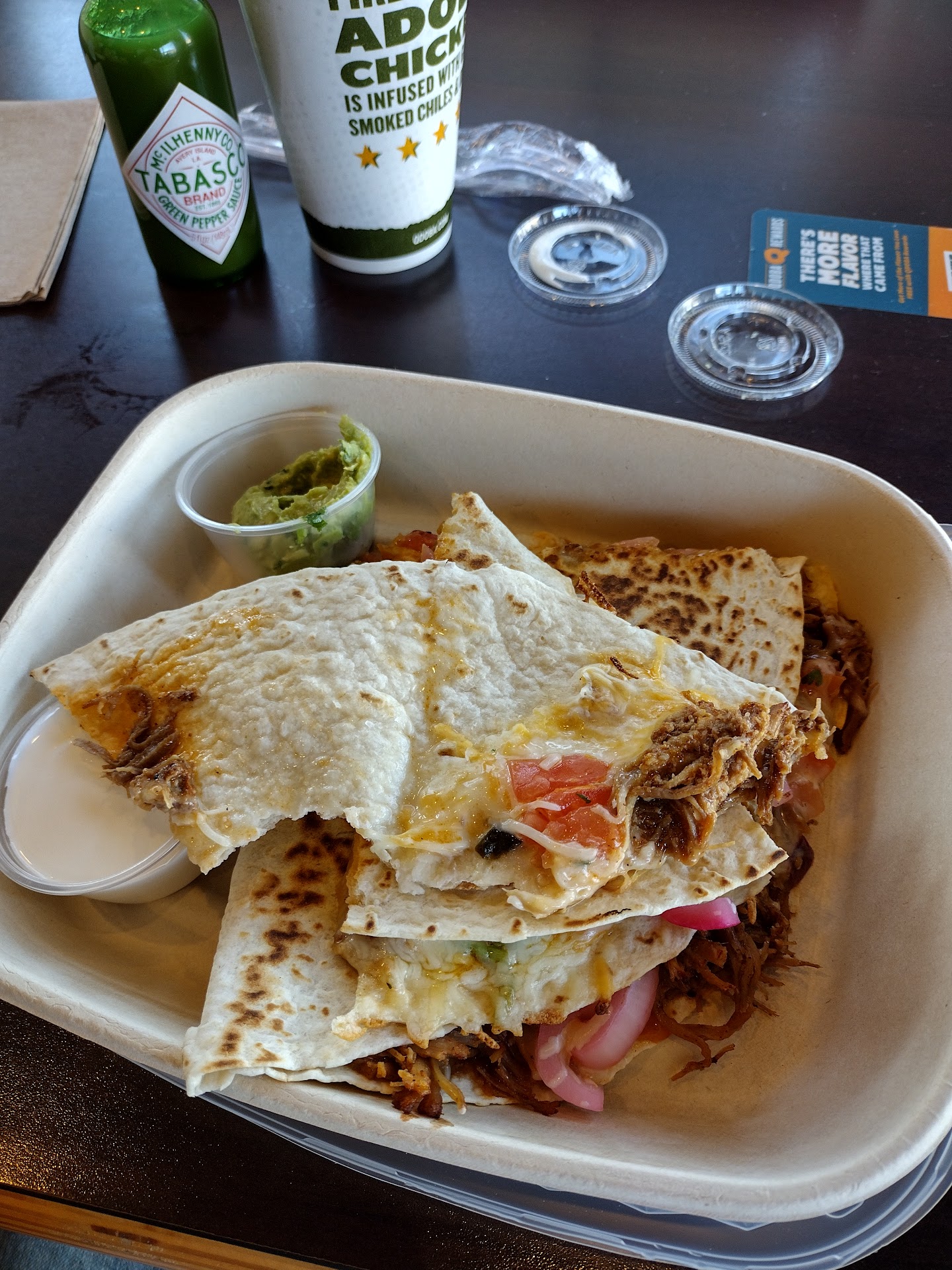 stopped here for a late lunch and i have to say we were very disappointed. chips were EXTREMELY salty and i couldn't tell for sure but it seemed like the queso was extra salty as well. even though there was plenty of meat in my boyfriend's quesadilla one piece had so little meat, it almost wasn't worth eating. a little more attention to detail would be great for the price we pay to eat here.