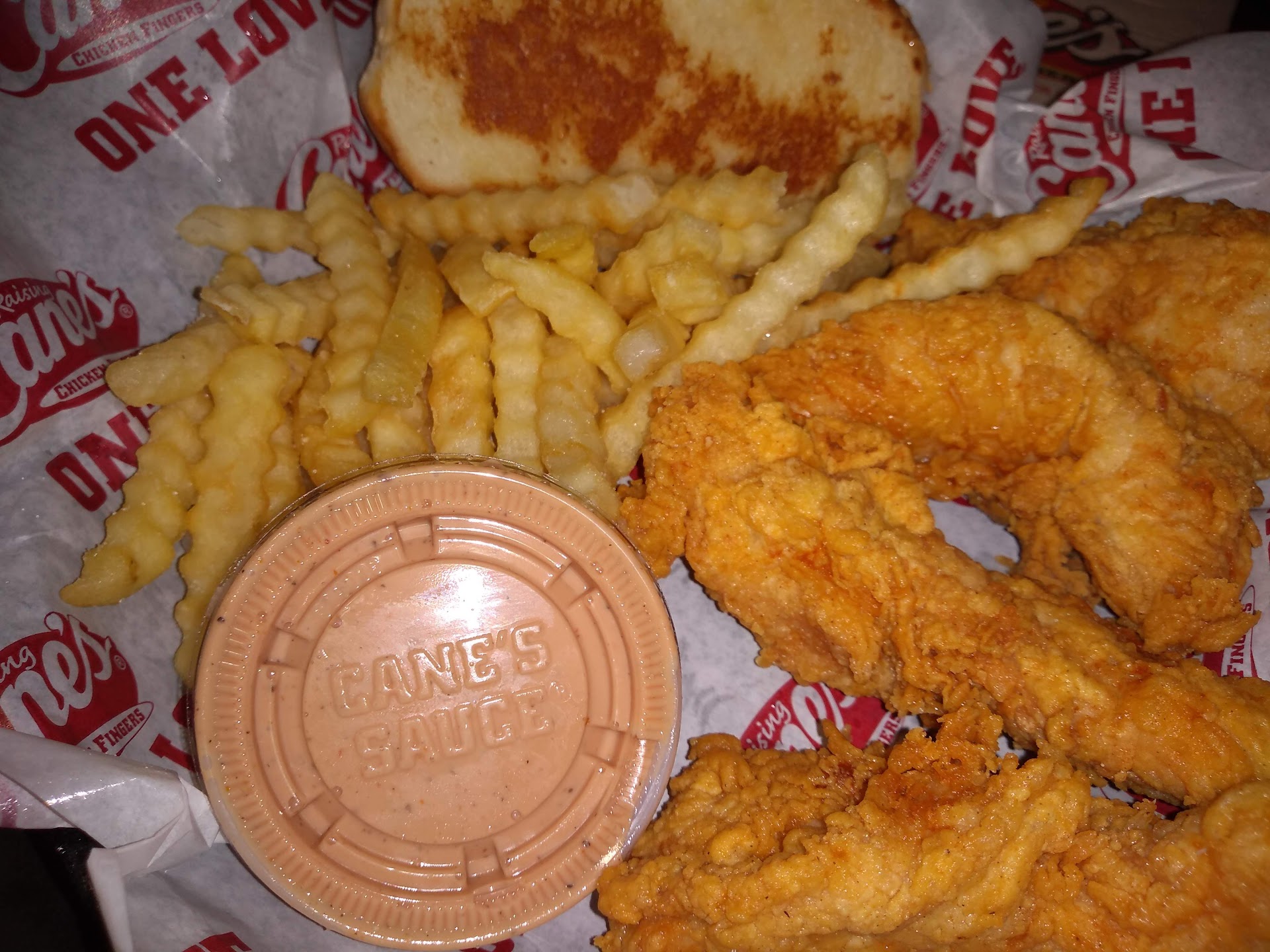 Read moreThe service here is always fast and I have never had a order incorrectly made. The food is made to order with the chicken strips constantly made fresh. I can't rave enough about the bread and the canes sauce. Both are fantastic! The sweet tea, which I get frequently here, is just the right amount of sweet, not too much. Same goes for the lemonade. I had a last minute large group order and I was unable to order in advance like I normally do, they were completely ok and had my order made in less than fifteen minutes. I was impressed by the fact that they were very accommodating and not frustrated with the fact that I had no prior notice. They made everything fresh and made sure that they double checked and had everything I ordered correctly before I took the bags and left. Kudos to them. I dont often go inside, as I utilize the drive thru most, but when I do go inside, I am greeted almost instantly and the store is always pretty clean. This place is always popular, no matter what time you go, so sometimes there is a small wait, but it will go quickly and you can get out of the there quickly. Be careful when you go across the parking lot if you are dining inside, as the traffic is a bit hectic and parking is limited, but it...