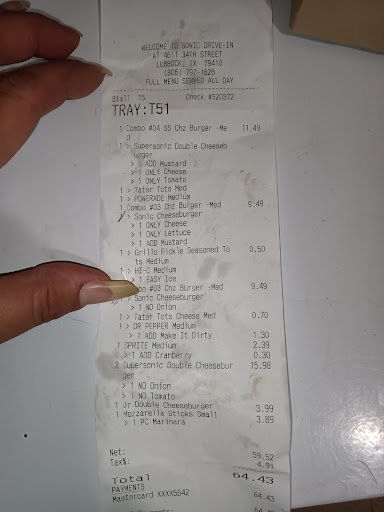 Read moreNot happy with this location! They have gotten my order wrong on several occasions. When you try to correct them on something over the intercom - they act like they understand, but it's only lipservice! They charge for one meal (double patty)& give another (single) of course you don't find out until you get home - unless you unwrap every item, which starts everything to chilling down. If they make a mistake & add the wrong item to your order, good luck getting it removed. Apparently they like to leave it on so they can continue to charge you for it as well. I'm done with this Sonic,as well as the other one on 34th. Btw, I have tried calling both places when there have been issues, neither will answer. I have also reached out to corporate & no one would respond. So...