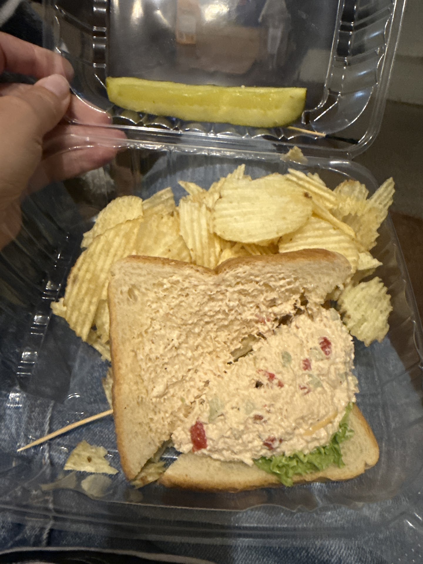 A few minutes later my sad, sad sandwich arrived. The entire sandwich was less than 1-1/4" thick. The plain store-bought sandwich bread was warmed but not toasted and the bacon was limp, cold and appeared to have just been pulled from the refrigerator. The sandwich had one small piece of wilted, slimy lettuce. The bacon was limp, stretchy, and not even heated, much less crisp. I then returned to the counter to ask for the rest of my order. The fellow looked confused. I said the menu said all sandwiches are served with chips, a pickle spear and a muffin but all I received was the sandwich. He then prepared another plate with the missing items.