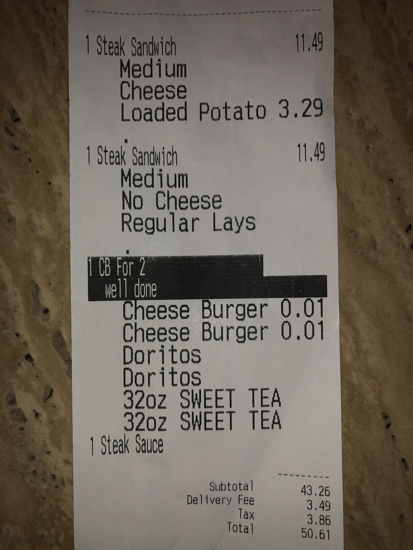 Large delivery order placed via phone. Family meal deal for 38+tax this includes nice portion of steak tips sitting in their sauce (you know the French word)... Also includes grilled chicken in it's own foil pack of juice. Omg. Perfectly grilled. Juicy. Tender. Well cooked chicken. Baked potatoes were hot and average sized but not small. Salad was lettuce and a tomato. Sweet tea had a smoke flavor but I got past it. The family meal fed 5 people and we have left overs for another two meals. This completes the family meal deal. Cheese burger deal 27.99: Four thick juicy cheese burgers with chips and drink. Burgers were a tiny bit undercooked because I'm not a fan of pink burgers. Flavor was insanely good. I didn't need mayo etc or the toppings. The burger is just that good. I think the price of this burger deal is a bit excessive. 20.99 is what it should cost with a coupon not 27.99